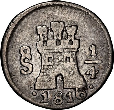 CHILE, Santiago, ¼ real, 1816, recut 6 in date, NGC VF details / rim filing (Val y Mexía Collection