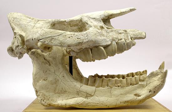 Chilotherium was a huge early rhino that looked somewhat like a cross between a rhino and a hippo. It had a barrel shaped body with short legs like a hippo (possibly aquatic) but a very rhino-like face and head with two strange knob shaped horns made out of hair like a rhino and two tusk teeth in the bottom jaw. An impressively mounted huge fossil skull free standing on a custom wooden base.