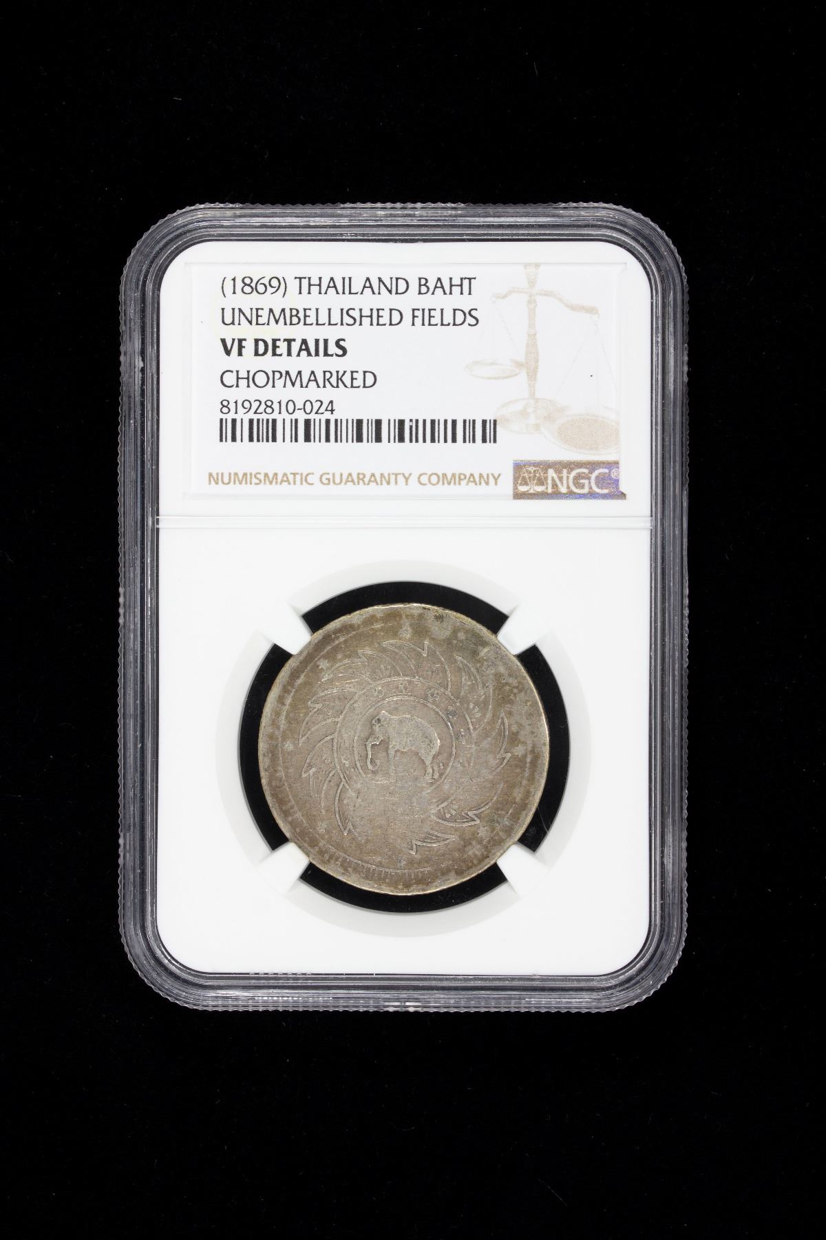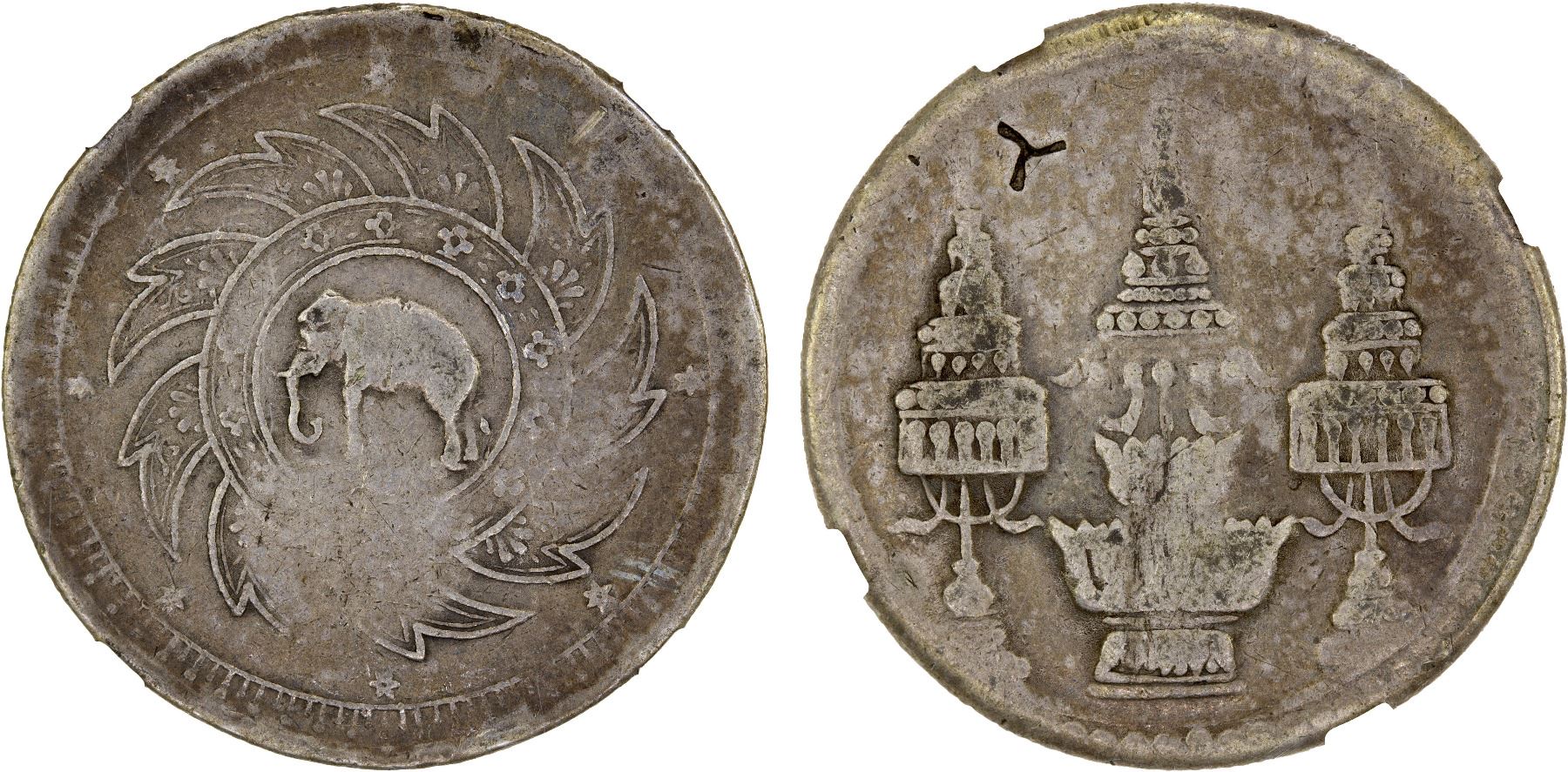 CHINA: CHOPMARKS: THAILAND: Rama V, 1868-1910, AR baht, ND (1869), Y-31, elephant within chakra, with a small Chinese merchant chopmark, NGC graded VF Details.