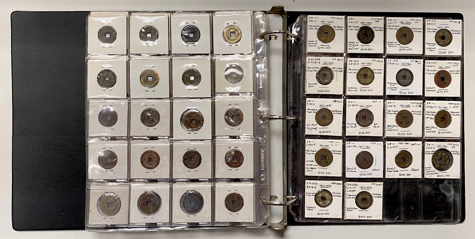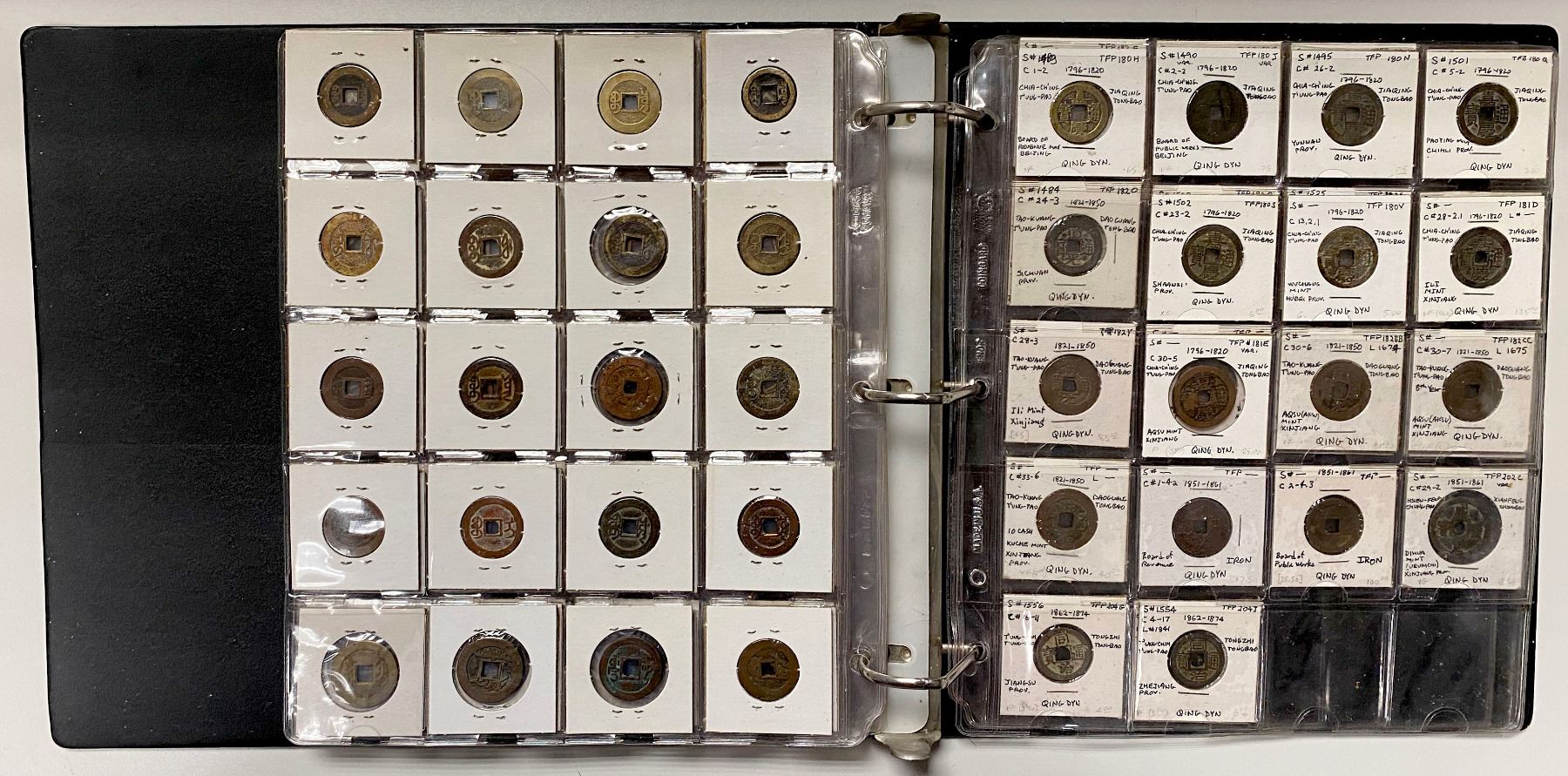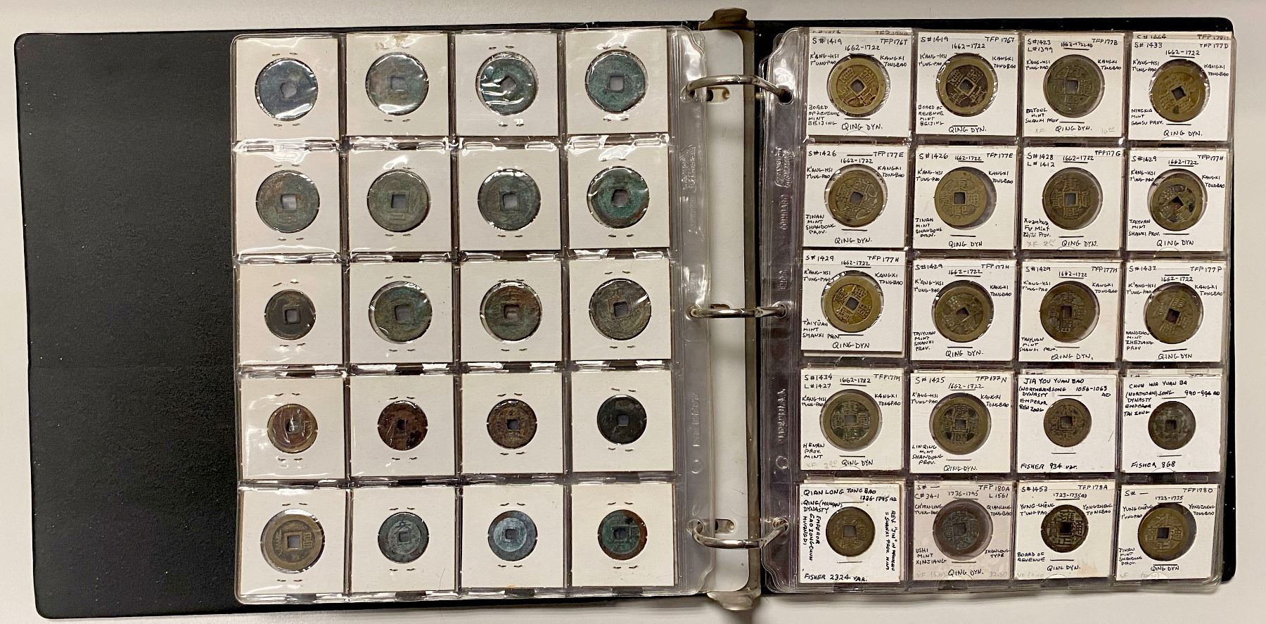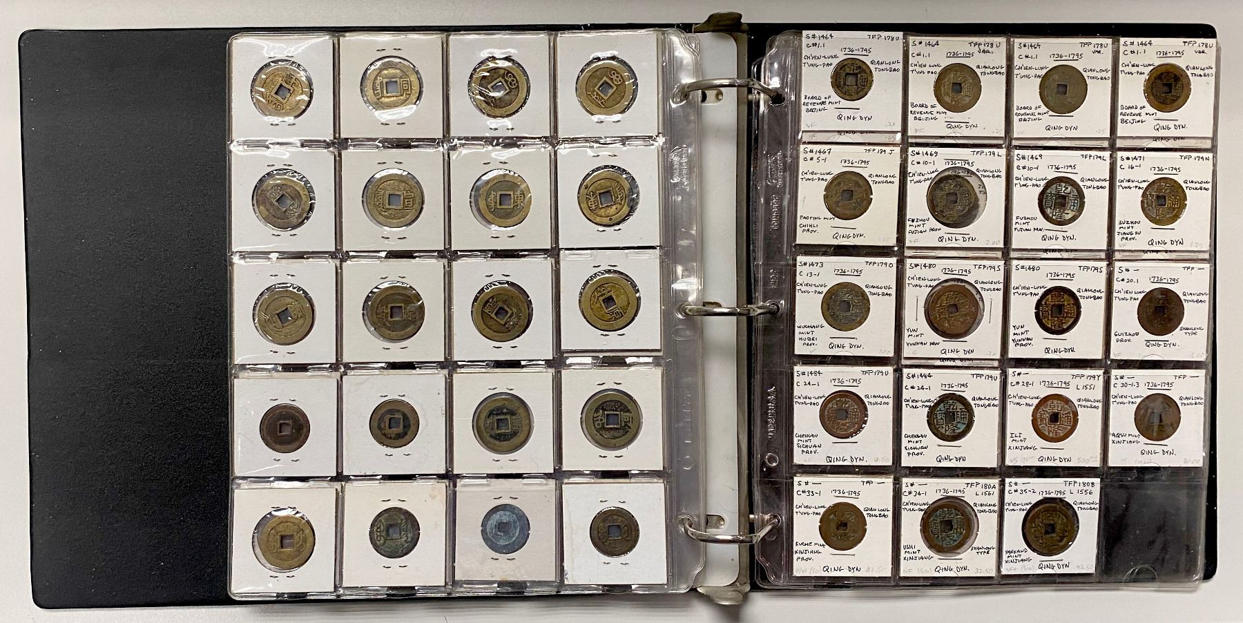 CHINA: LOT of 131 coins, a collection of cash coins from the Western Han dynasty through the Qing dynasty, a nice collection including some scarce issues, all worked up in 2x2 holders, set in three ring binder, average circulated quality examples, retail value $650, lot of 131 coins.