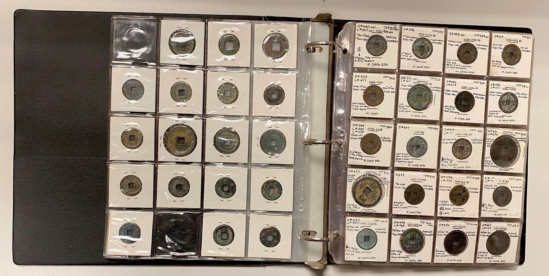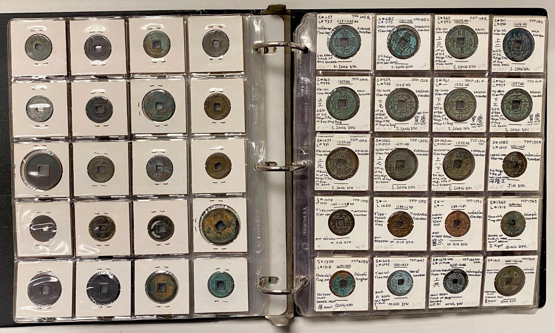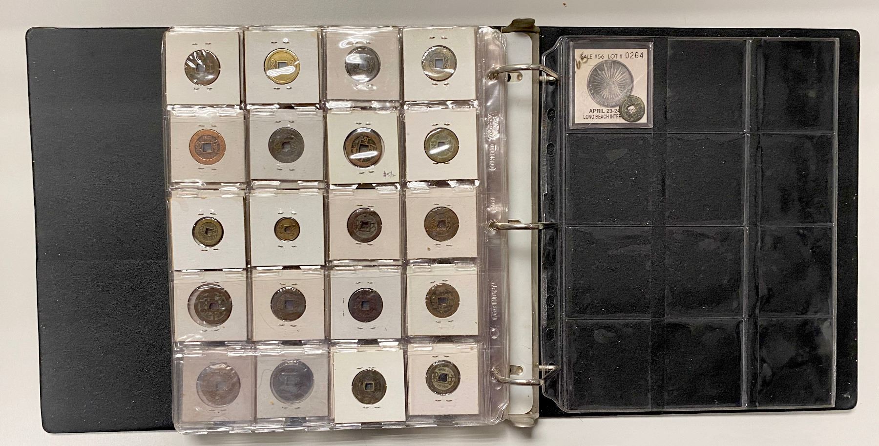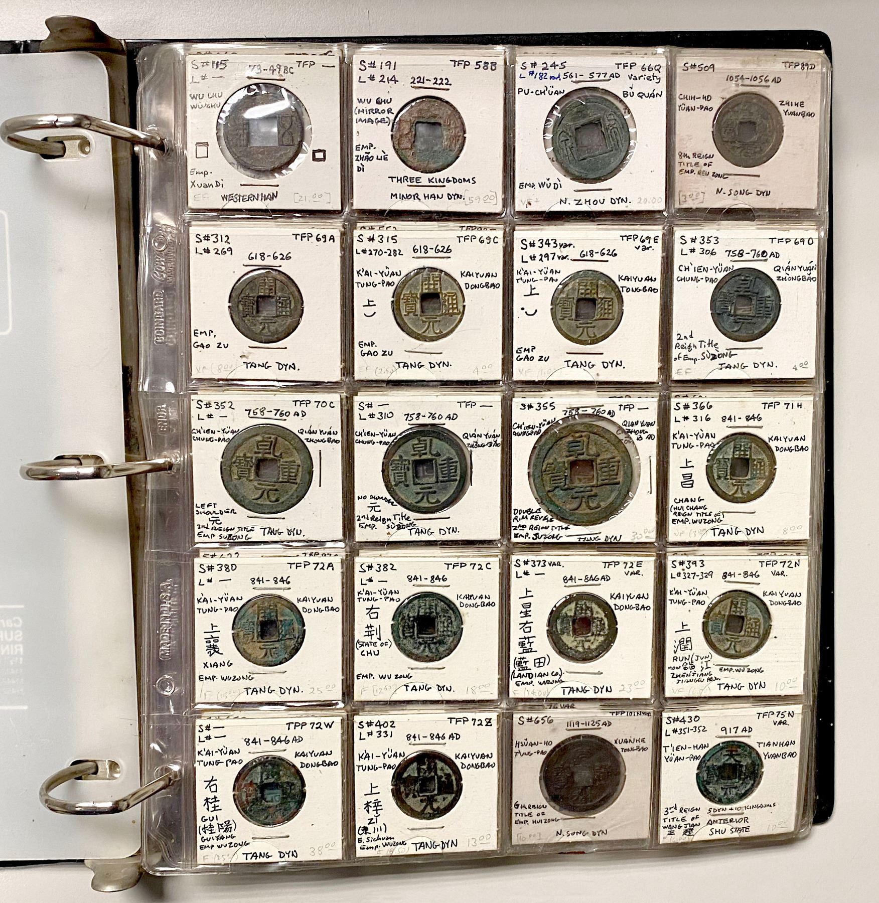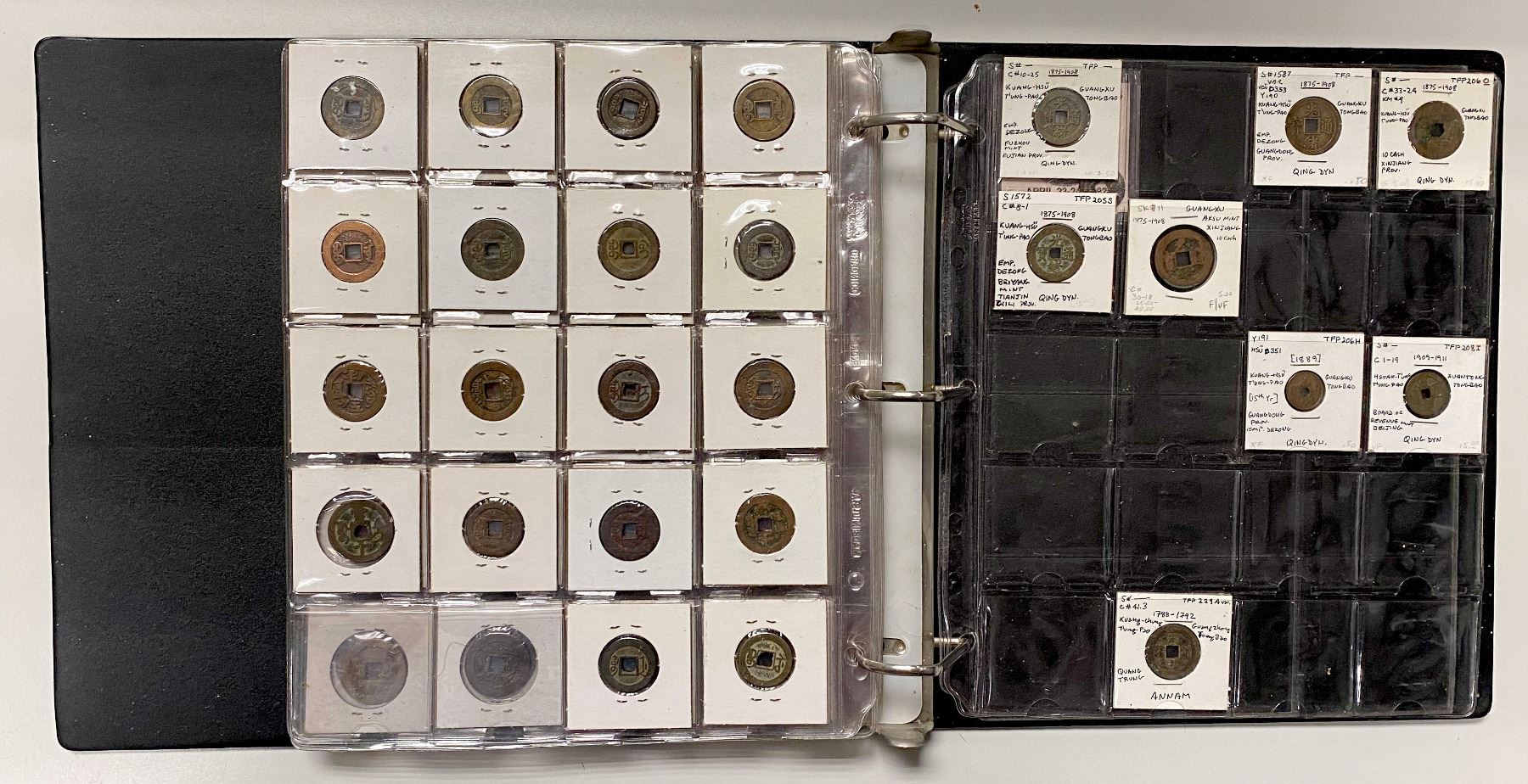 CHINA: LOT of 131 coins, a collection of cash coins from the Western Han dynasty through the Qing dynasty, a nice collection including some scarce issues, all worked up in 2x2 holders, set in three ring binder, average circulated quality examples, retail value $650, lot of 131 coins.