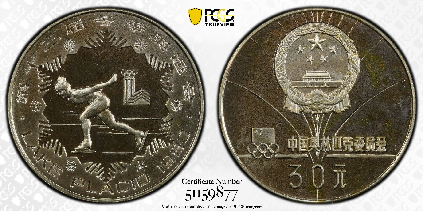 CHINA (PEOPLE'S REPUBLIC): AR 30 yuan, 1980, KM-26, Y-21, Moscow Olympics-Speed Skating, a fantastic example, PCGS graded PF66 Cameo.