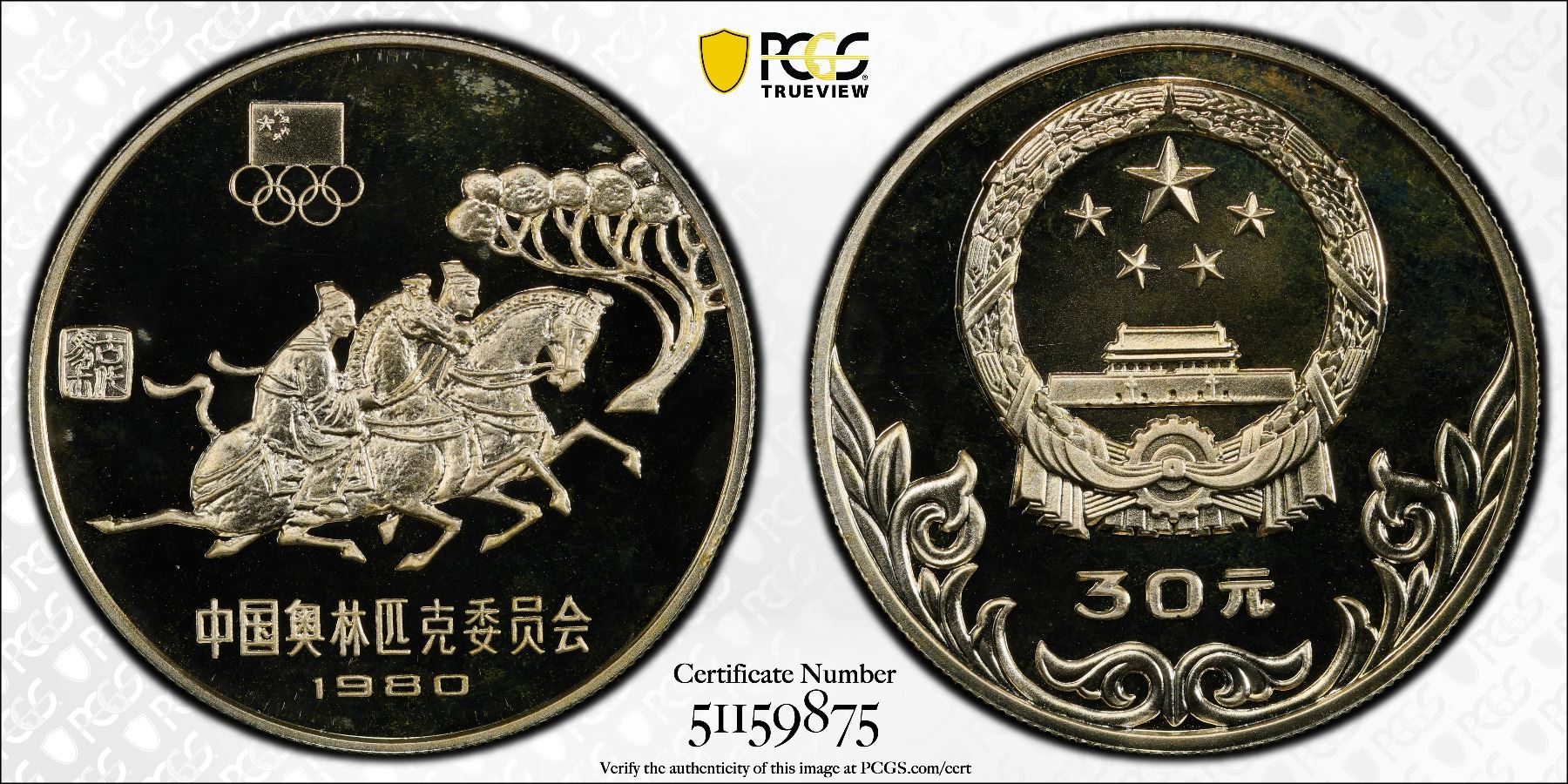 CHINA (PEOPLE'S REPUBLIC): AR 30 yuan, 1980, KM-35, Y-19, Moscow Olympics-Equestrian, a spectacular example, PCGS graded PF68 Deep Cameo.