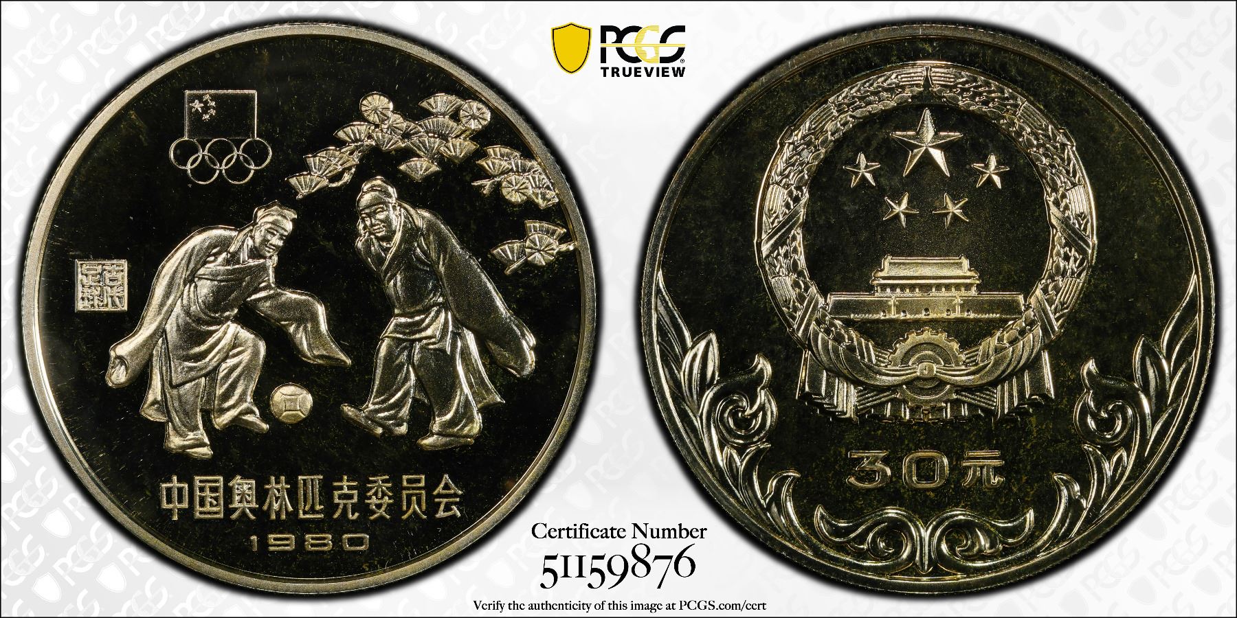CHINA (PEOPLE'S REPUBLIC): AR 30 yuan, 1980, KM-36, Y-20, Moscow Olympics-Soccer, a spectacular example, PCGS graded PF68 Deep Cameo.