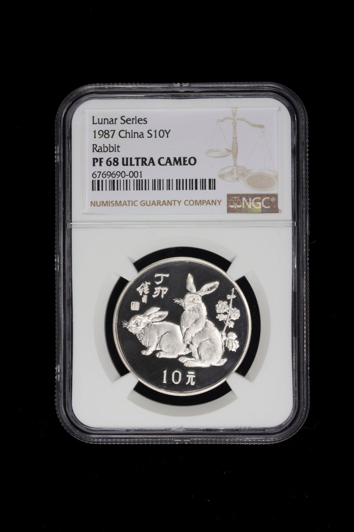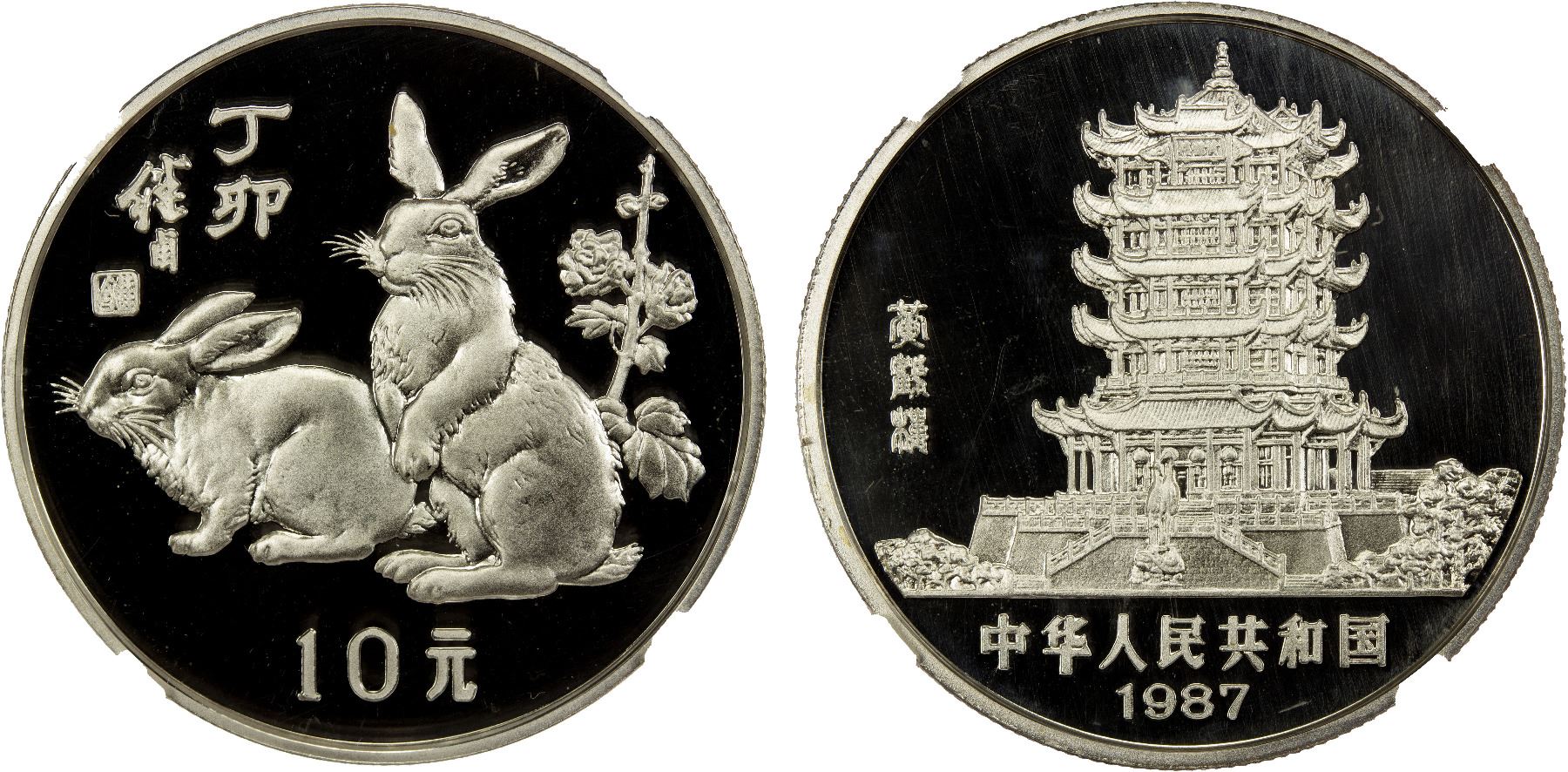 CHINA: People's Republic, AR 10 yuan, 1987, KM-169, Lunar Series, Year of the Rabbit, Yellow Crane Tower (huang he lou) on reverse, NGC graded PF68 Ultra Cameo.