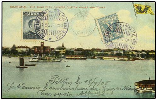 1908 Picture post card to the 16th Regiment of French Troops at Peking bearing Italy 5 cent green (Yvert 66) and 15 cent grey (Yvert 78) tied by Italian Post Office DISTACCAMENTO R. MARINA IN CINA datestamp with French Post Office arrival in Pekin (Pothion Type 84). A very fine item of internal foreign post office mail.