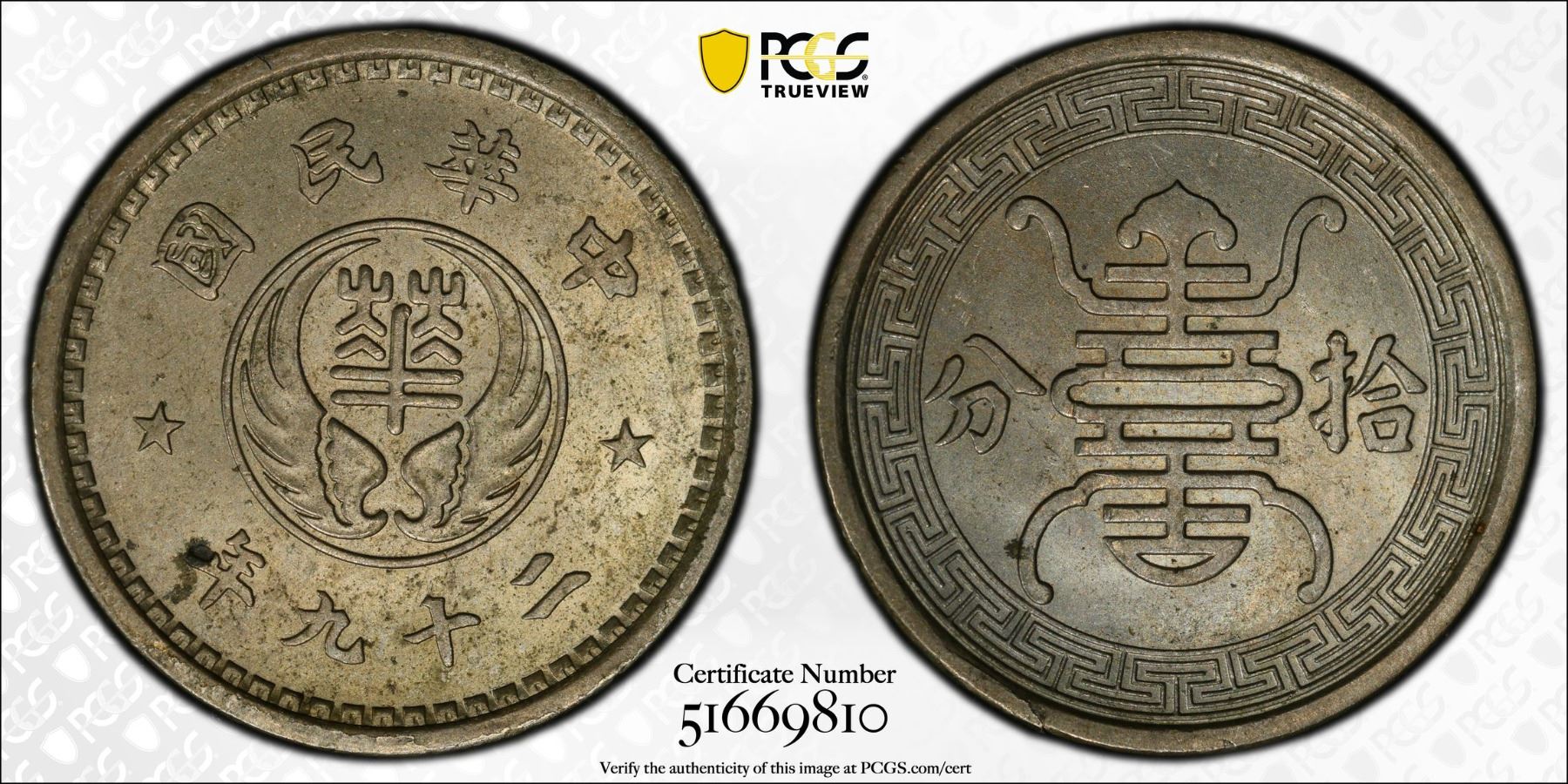 CHINA: Reformed Government, 10 fen, year 29 (1940), Y-522, JNDA-23-2, Japanese Puppet State, Hua Hsing Bank issue, one-year type, a lovely mint state example! PCGS graded MS63, ex Almer H. Orr III Collection. The Huaxing Commercial Bank was a central bank of the Japan-supported Reformed Government of the Republic of China that governed the Jiangnan region of China during early years of the Second Sino-Japanese War. It started operations in Shanghai in May 1938, was reorganized as a mere commercial bank following the creation of the Central Reserve Bank in January 1941, and stopped operating in August 1945.