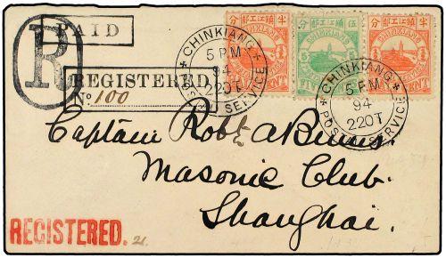 1894 Reg. cover bearing 1/2 c. (x2) & 5 c. (SG 1, 5) tied by Chinkiang Postal Service Oct 22 cds to SHANGHAI. Framed ´PAID´ and registration chops on front. Sender´s private circled ´R´ and register chop in red also applied. Very rare usage with both stamps franking and ´PAID´ chop.