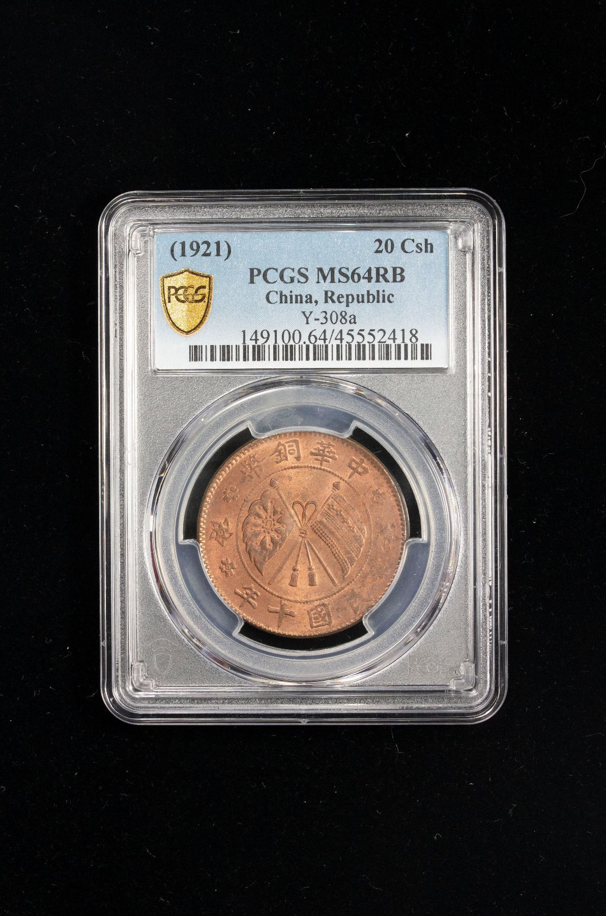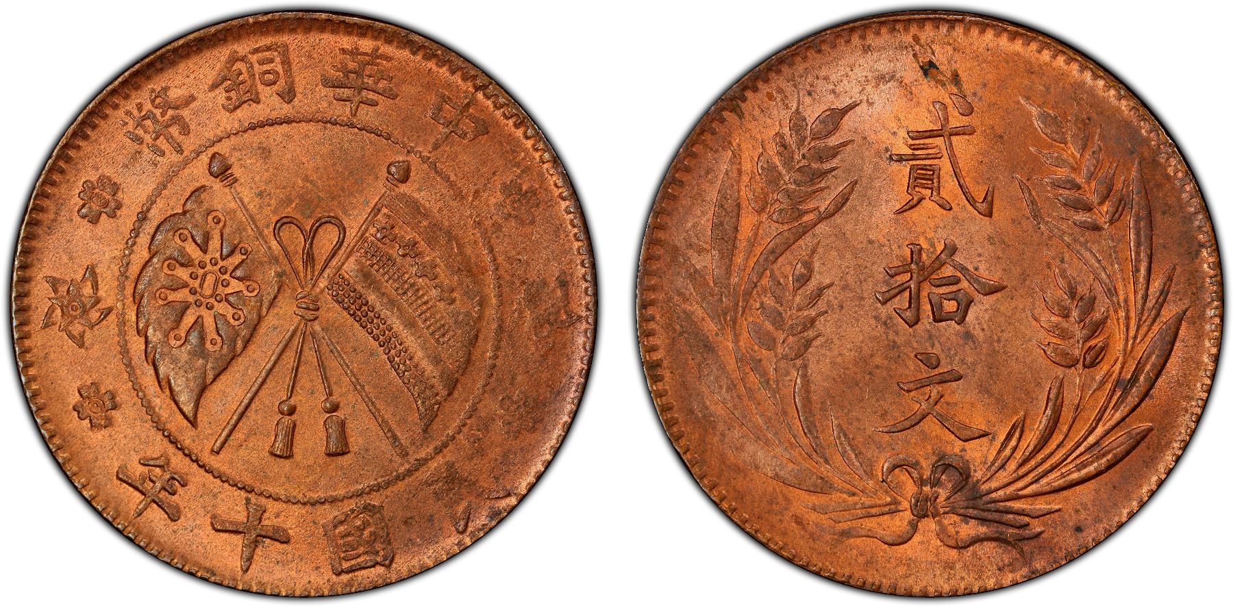 CHINA: Republic, AE 20 cash, year 10 (1921), Y-308a, 1st issue with ornate flag at right, a wonderful lustrous example with much mint red! PCGS graded MS64 RB.