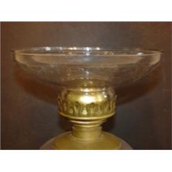 CHINA STEMMED OIL LAMP. Red transferware decorated stem. Unelectrified. Clear glass bowl. 15.25" H to top of shade.