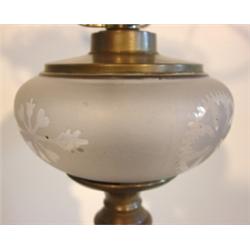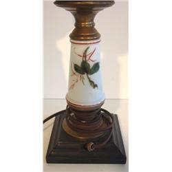 CHINA STEMMED TABLE LAMP WITH CLEAR GLASS ETCHED BOWL. Leaf decoration on base. Electrified. 16" H