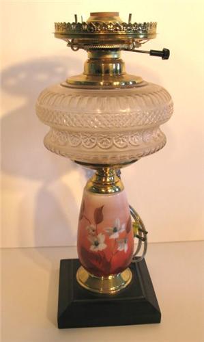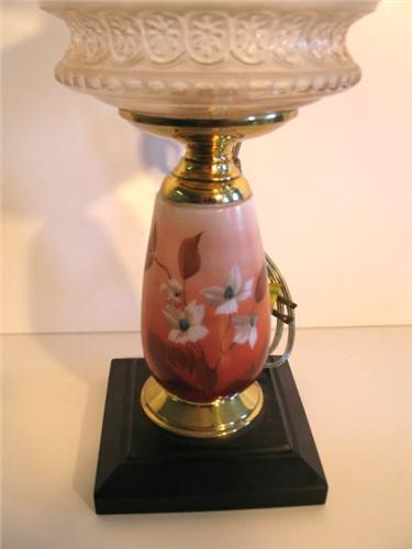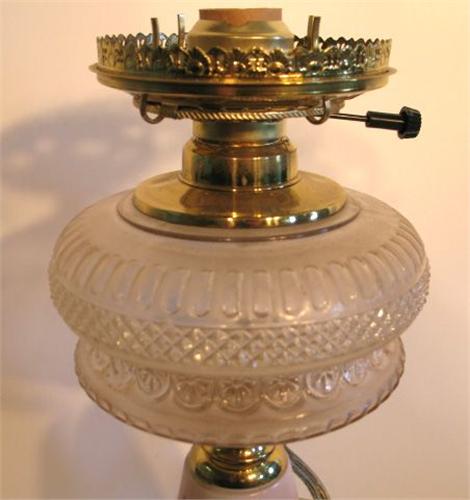 CHINA STEMMED TABLE LAMP. Stem is decorated with floral decoration. Lamp has clear pattern glass bowl. Electrified. 13.5” H