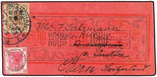 1897 Cover to SWITZERLAND bearing Dowager 8 c./ 6 c. (SG 42) tied by SHANGHAI dollar cds, in combination with Hong Kong 2 c. for external dispatch. A colorful combination cover.