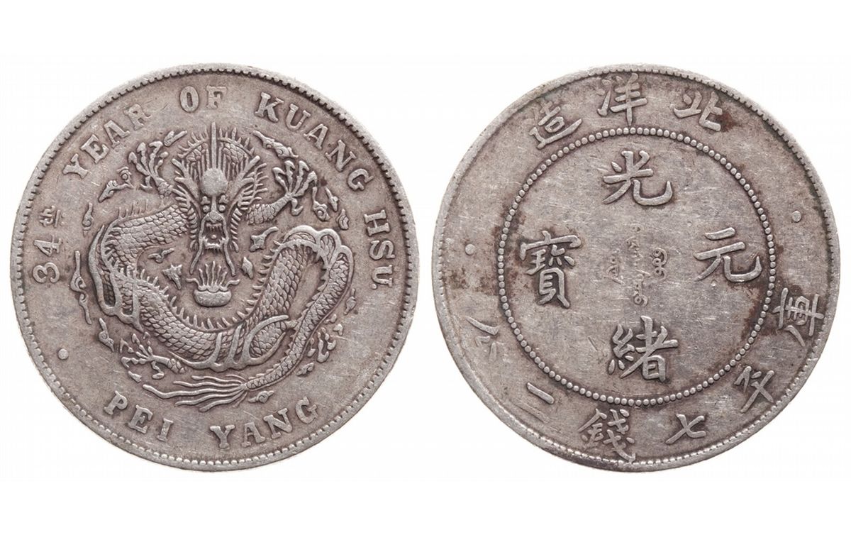 Dollar 1908 (year 34). 73.2. Chihli Province, side view dragon. Very Fine-30. RARE.