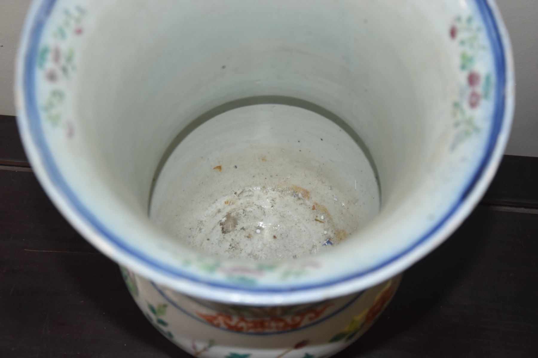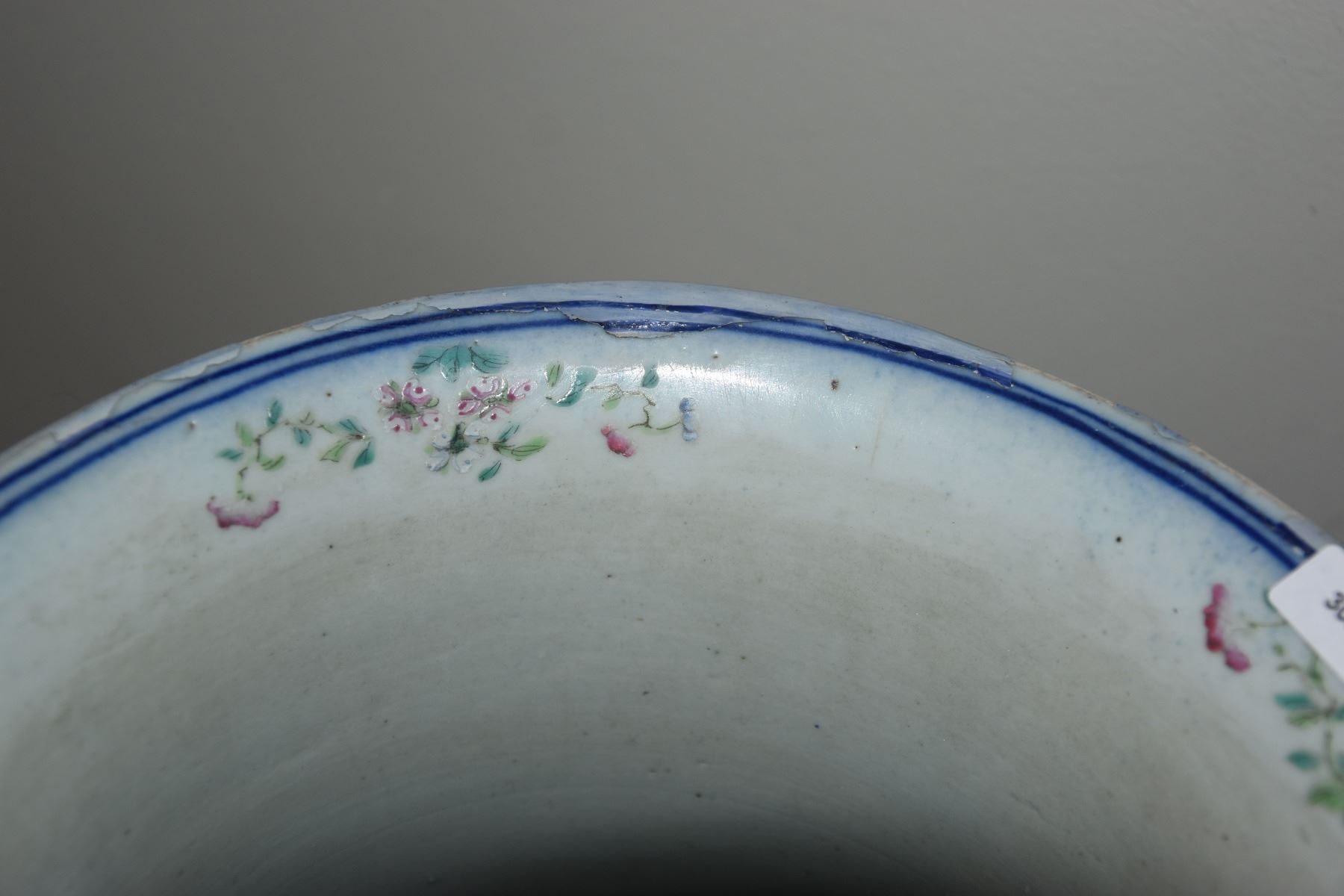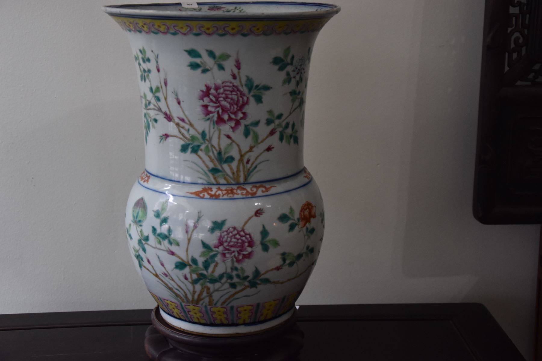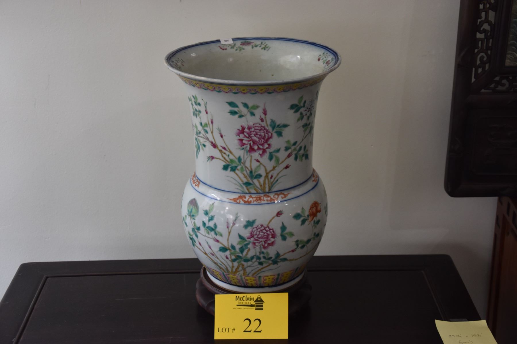 CHINESE 19TH CENTURY LATE QING DYNASTY PORCELAIN BEAKER VASE DECORATED IN FAMILLE ROSE POLYCHROME ENAMELS W/SPRAYS OF PEONY FLOWERS W/HARDWOOD STAND (REPAIR ON RIM OF VASE) (14")