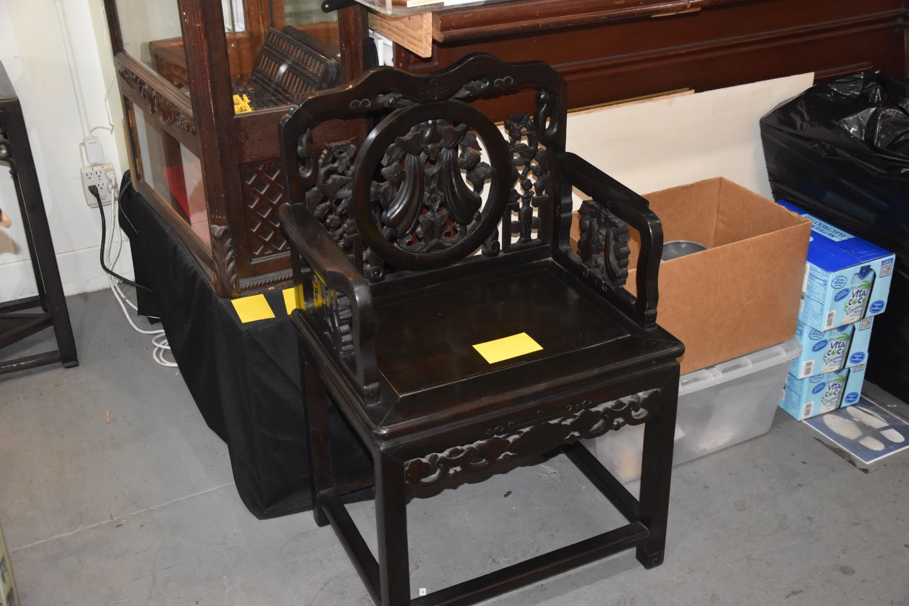 CHINESE 19TH CENTURY QING DYNASTY HARDWOOD ARM CHAIR, THE SERPENTINE TOP RAIL OVER A CIRCULAR RETICU