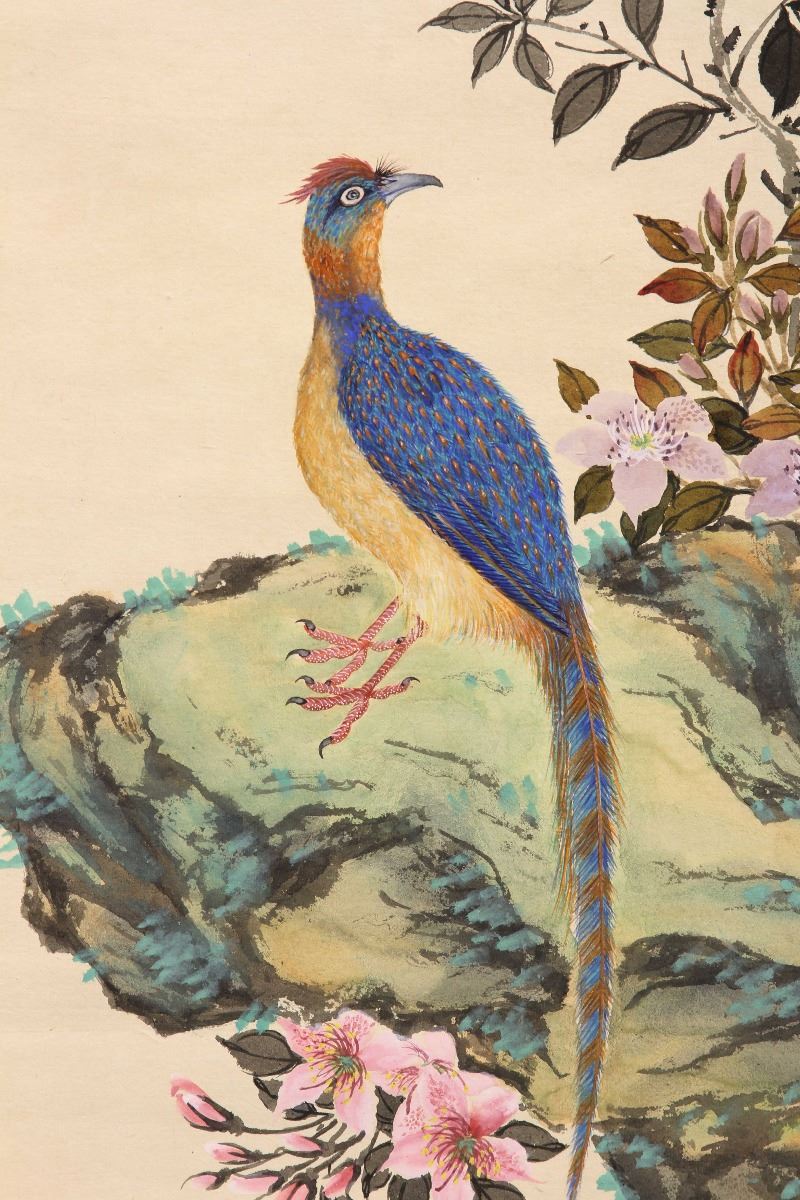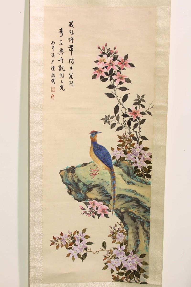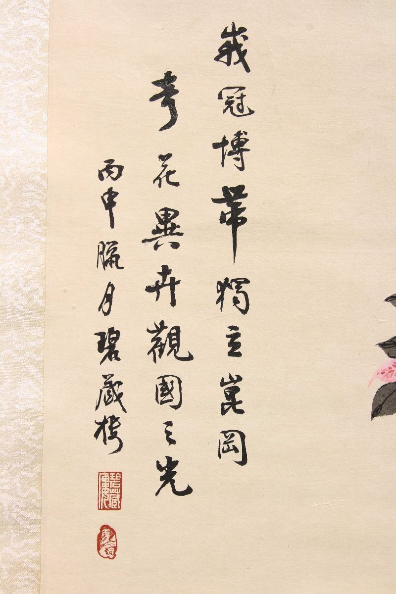 [CHINESE]A "BI CANG LOU ZHU"SEALED CHINESE WATER COLOR PAINTING OF BIRD AND FLOWER L:34" W:13.5"碧藏楼主款水彩花鸟卷轴