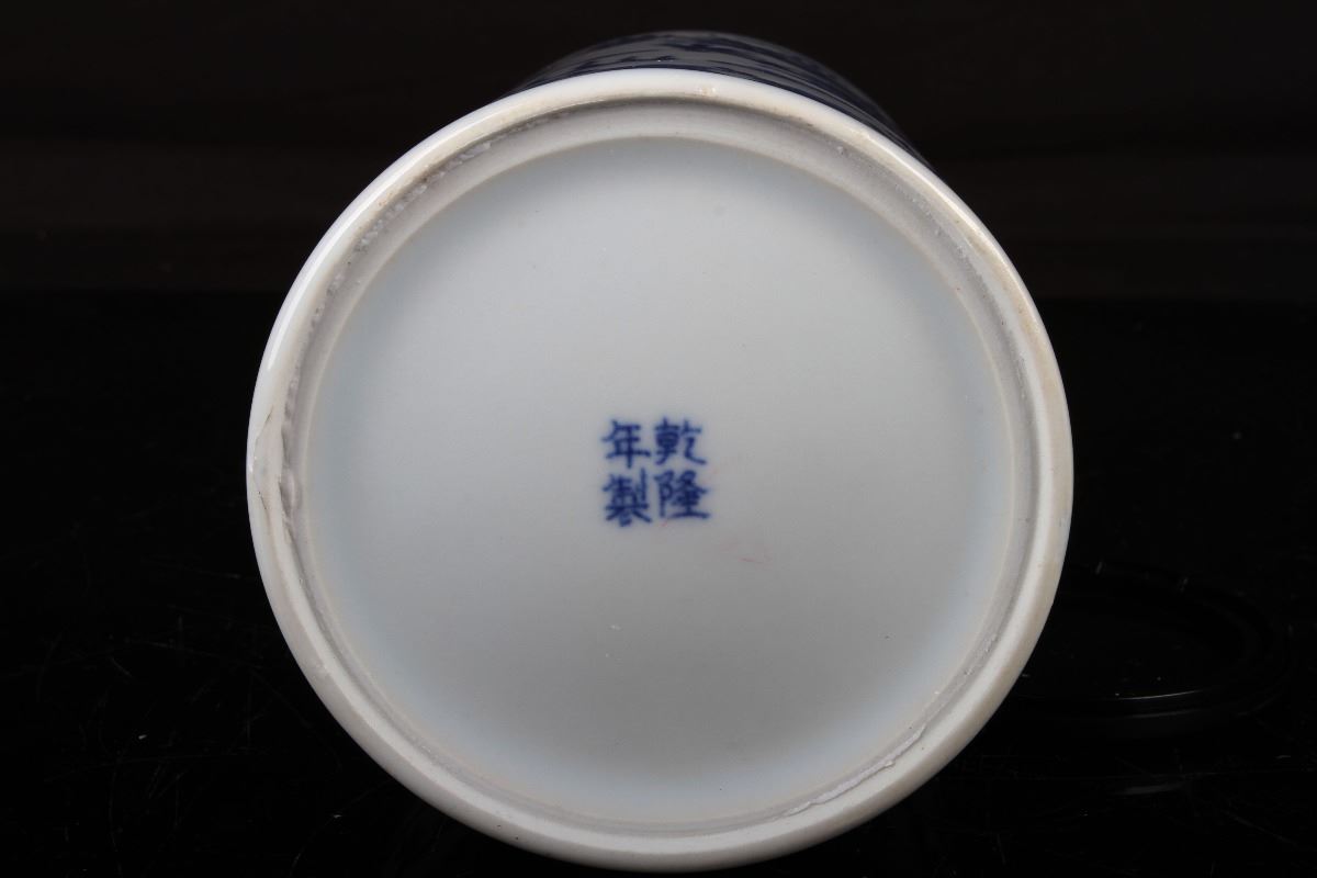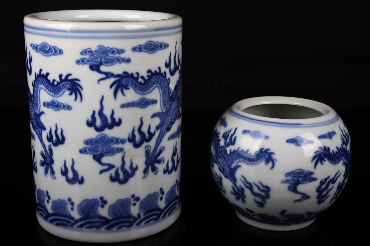 [CHINESE]A BLUE AND WHITE PORCELAIN WATER POT AND BRUSH POT PAINTED WITH DRAGONS (MEASURED WITH THE LARGEST ITEM) W:4" H:5.75"青花龍紋水盂及筆筒一組 (2 件) (最大物品计量)