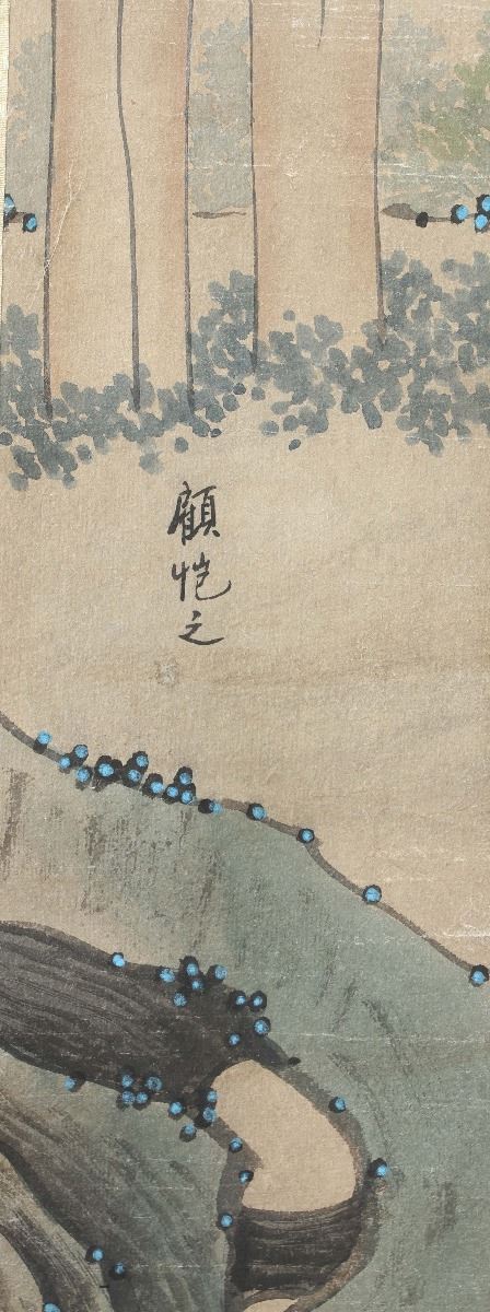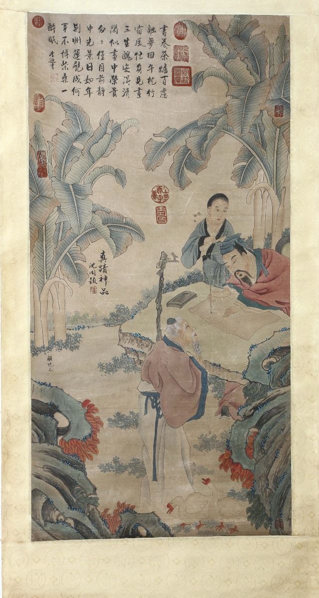 [CHINESE] A CHINESE PAINTING SCROLL WITH "GU KAI ZHI" SEALS顾恺之款人物卷轴画 配沈周题跋(顾恺之(约344年-405年),字长康,是中国东晋时代的画家,晋陵无锡(今江苏无锡)人,约364年在南京为石棺寺画维摩诘像,引起轰动。366年当上大司马参军,392年为殷仲堪参军,405年升为散骑常侍。