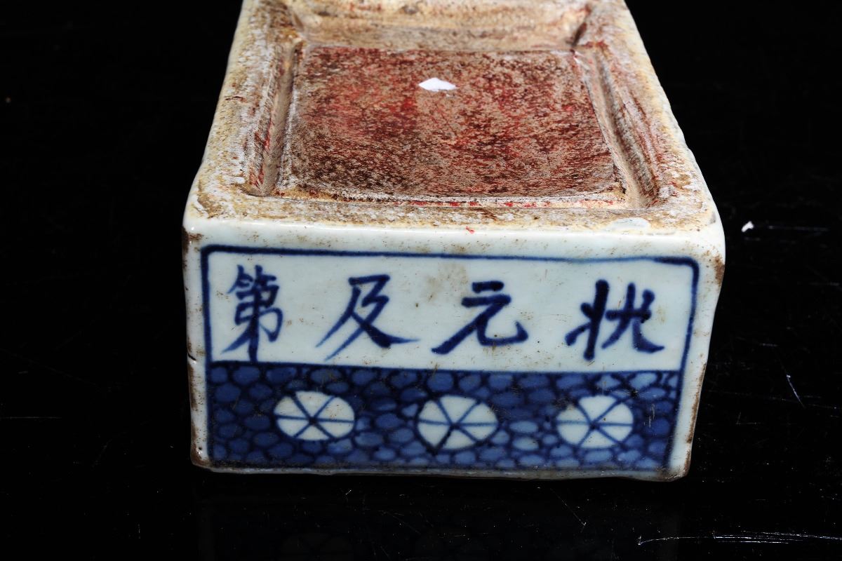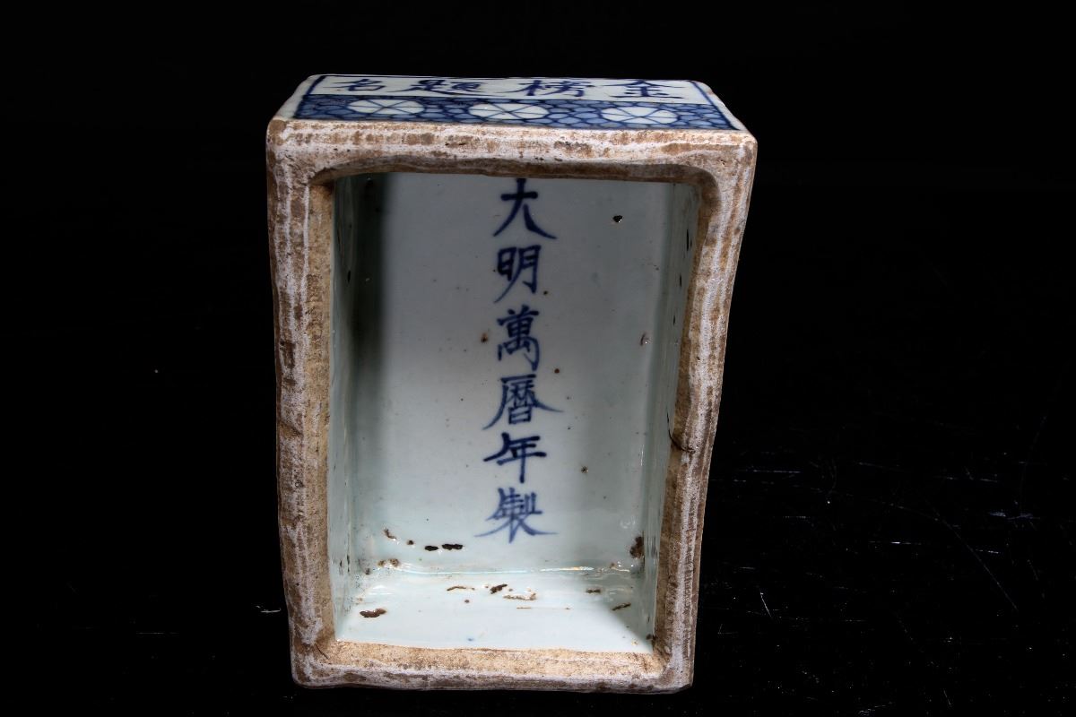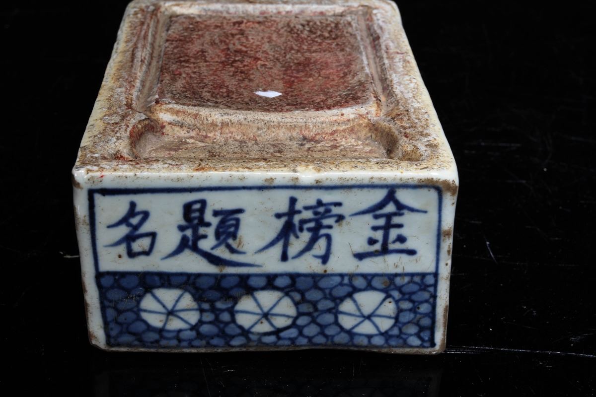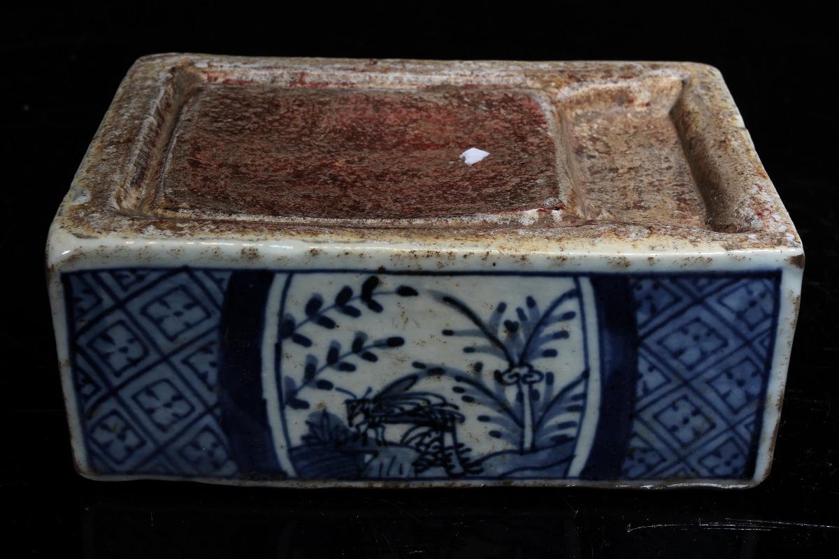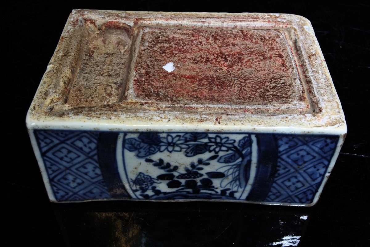 [CHINESE]A "DA MING WAN LI NIAN ZHI"MARKED BLUE AND WHITE PORCELAIN INK STONE PAINTED WITH INSECT AND FLOWERS L:6.5" W:4.5" H:2.5"大明万历年制款青花虫草纹瓷砚