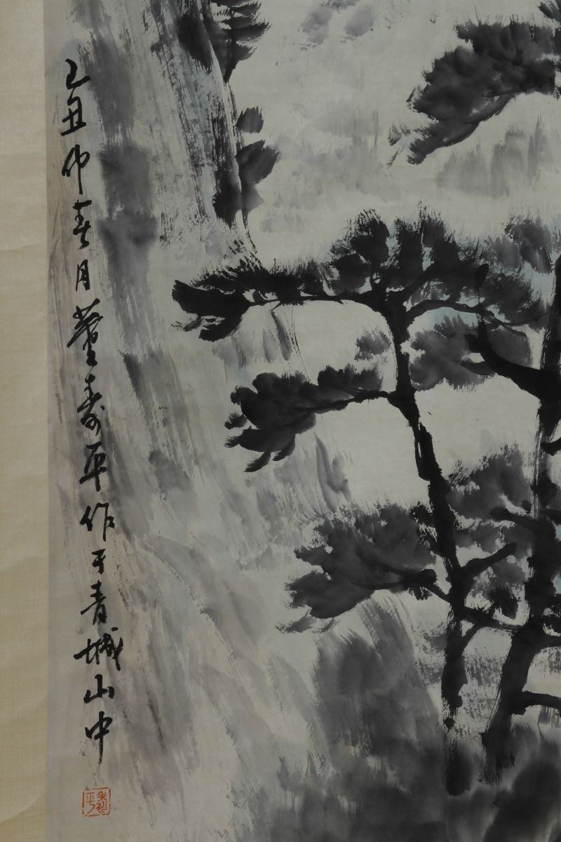 A DONGSHOUPING INSCRIBED WATER COLOR PAINTING SCROLL OF LANDSCAPE W:26" H:53"董寿平款水墨山水卷轴
