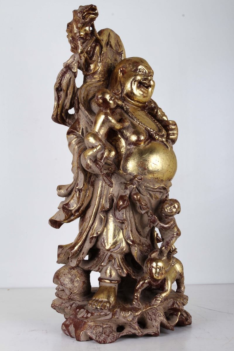 [CHINESE]A GILT WOOD CARVED STATUE OF MAITREYAS L:7" W:6.5" H:16.5"木雕鎏金笑佛像