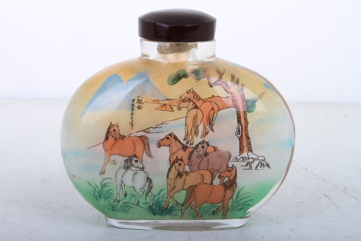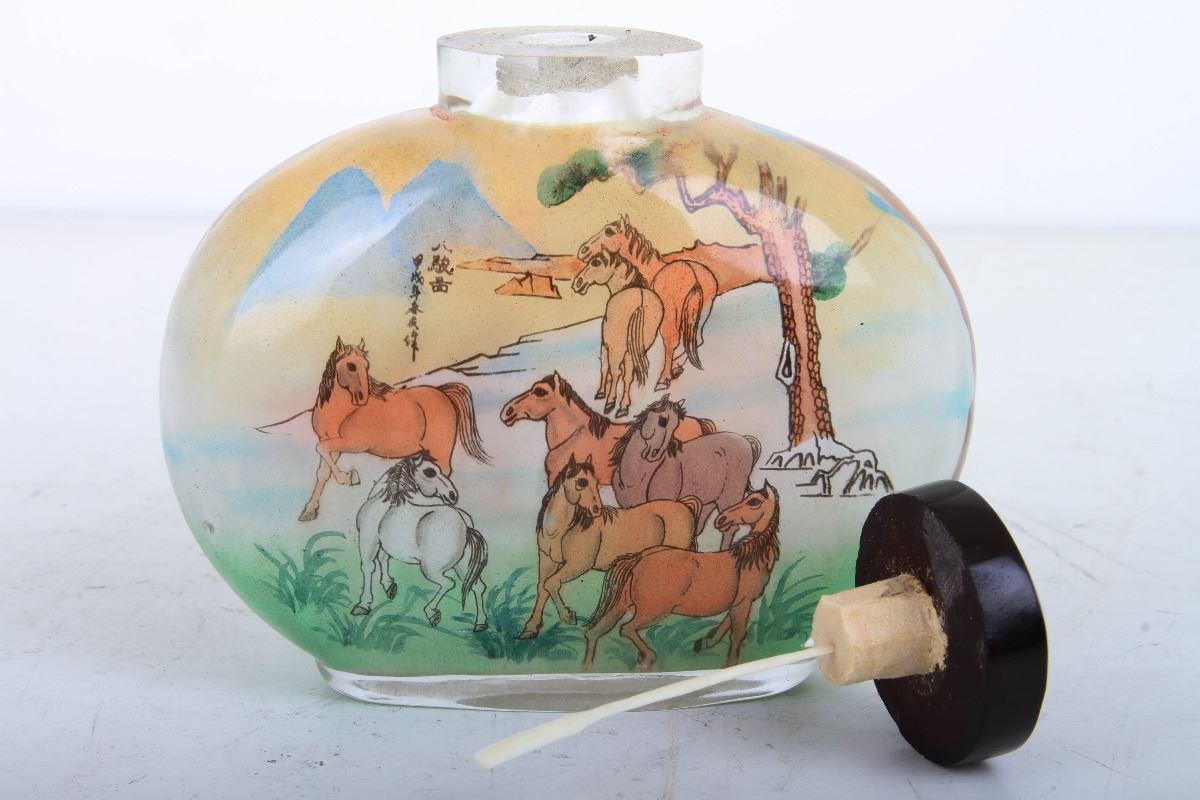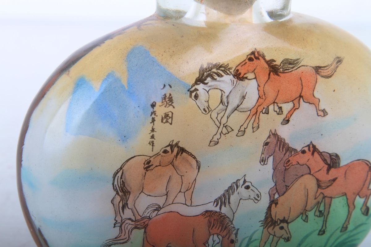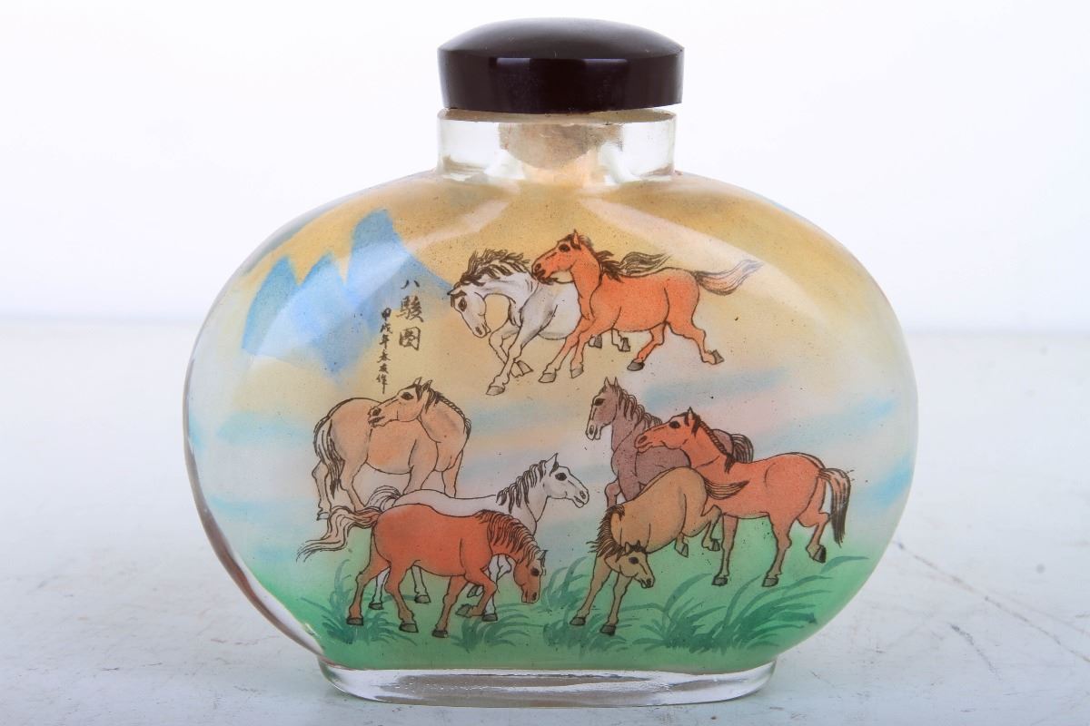 [CHINESE]A INSIDE PAINTING SNUFF BOTTLE PAINTED WITH HORES L:4" W:1.25" H:3.75"八骏图内画鼻烟壶