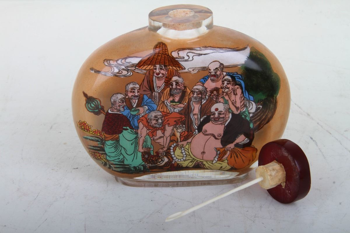 [CHINESE]A INSIDE PAINTING SNUFF BOTTLE PAINTED WITH THE FIGURES OF EIGHTEEN ARHAT L:4" W:1.25" H:3