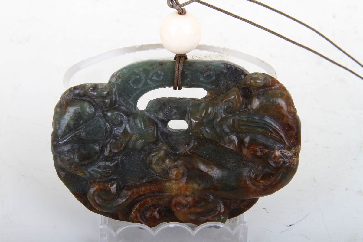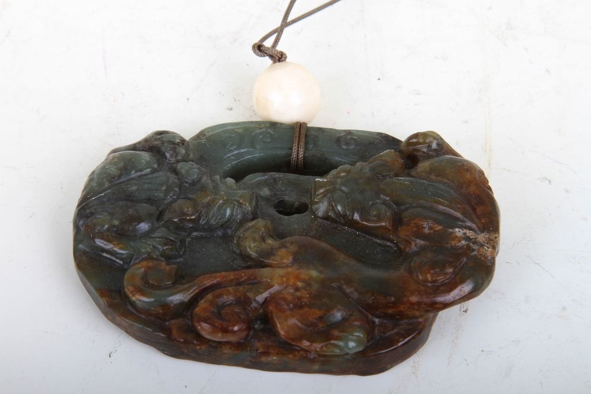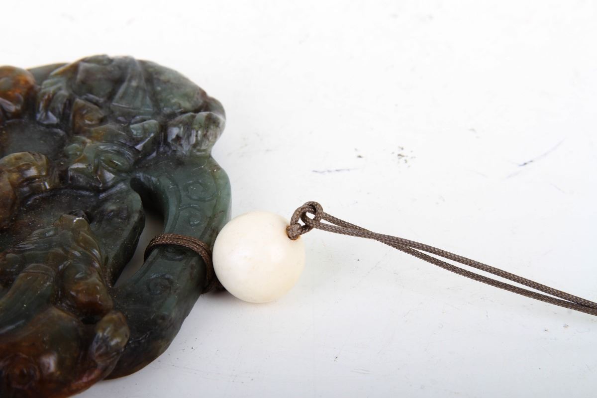 [CHINESE]A JADE CARVED PENDANT WITH BATS AND IVORY BEADS L:3" H:2" DISCLAIMER: This item is restricted from export out of the country due to protection under CITES (Convention on International Trade in Endangered Species). EXPORT IS AT THE BUYER'S RISK. Please note that bidders from the United States are not allowed to have ivory or rhino horn shipped into the country.玉制福紋佩 (配象牙顶珠)