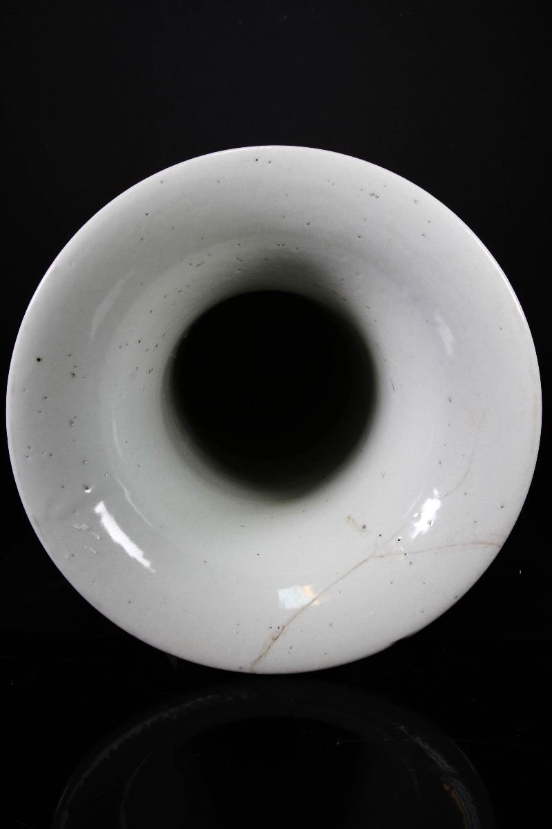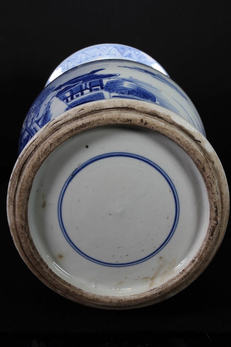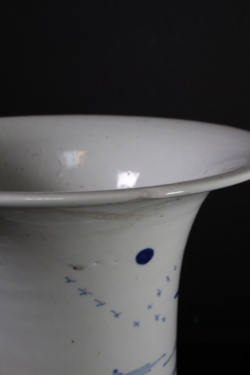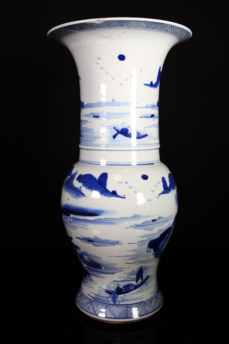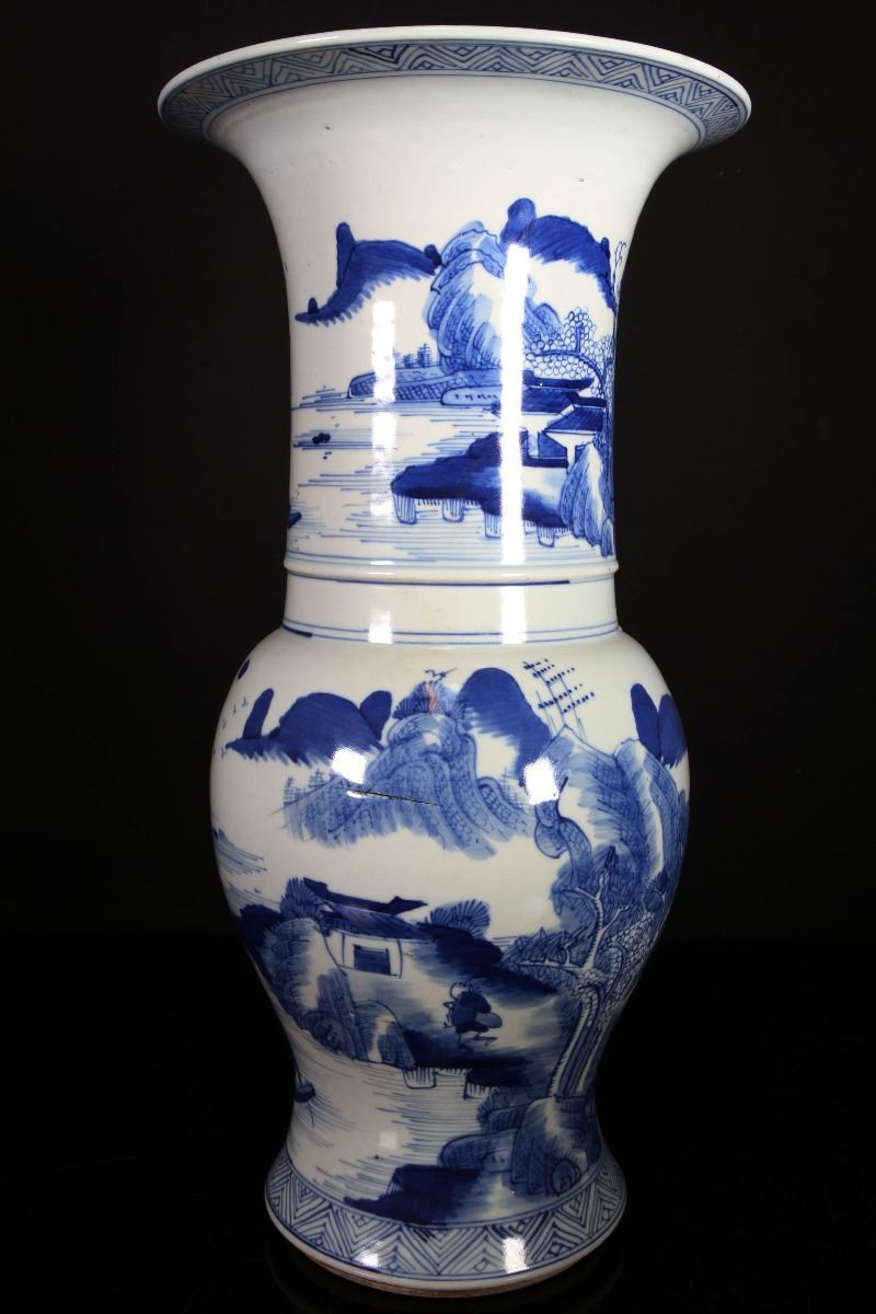 [CHINESE]A LATE 19TH CENTURY BLUE AND WHITE GU VASE PAINTED WITH FIGURES AND LANDSCAPE (RESTORATION ON THE TOP OF THE RIM) W:8.5" H:16"十九世纪后青花渔隐图花觚(瓶口有修补)