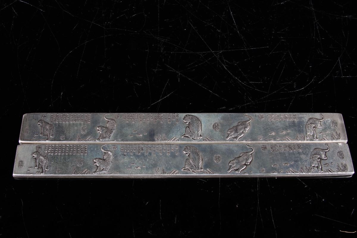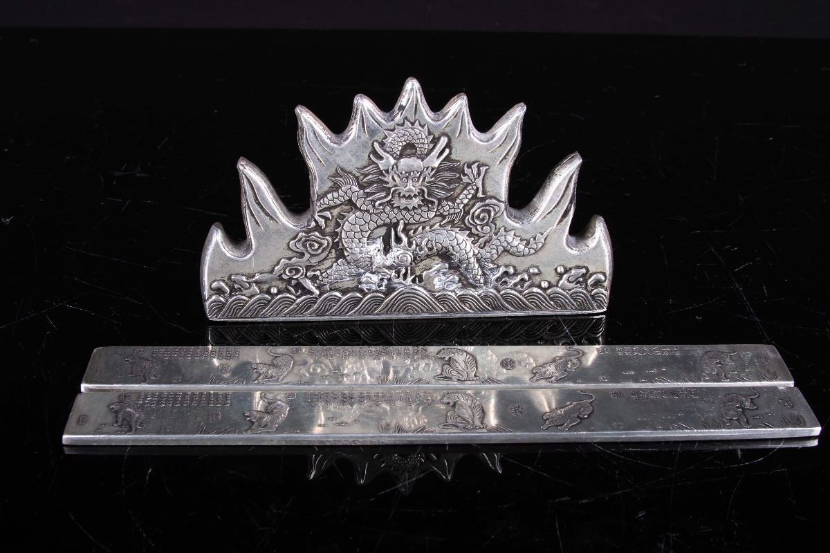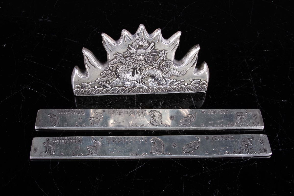 [CHINESE]A LATE 19TH CENTURY BRONZE PAPER WEIGHT AND BRUSH HOLDER CARVED WITH DRAGONS AND TIGERS (3 ITEMS) (MEASURED WITH THE LARGEST ITEM) L:9.15"十九世纪后五虎图镇纸及水龙纹笔架(3 件)(最大物品计量)
