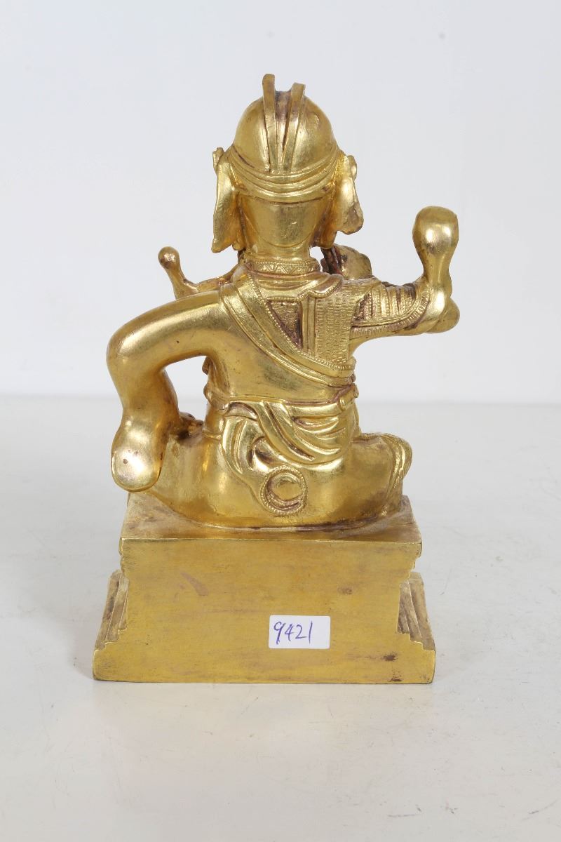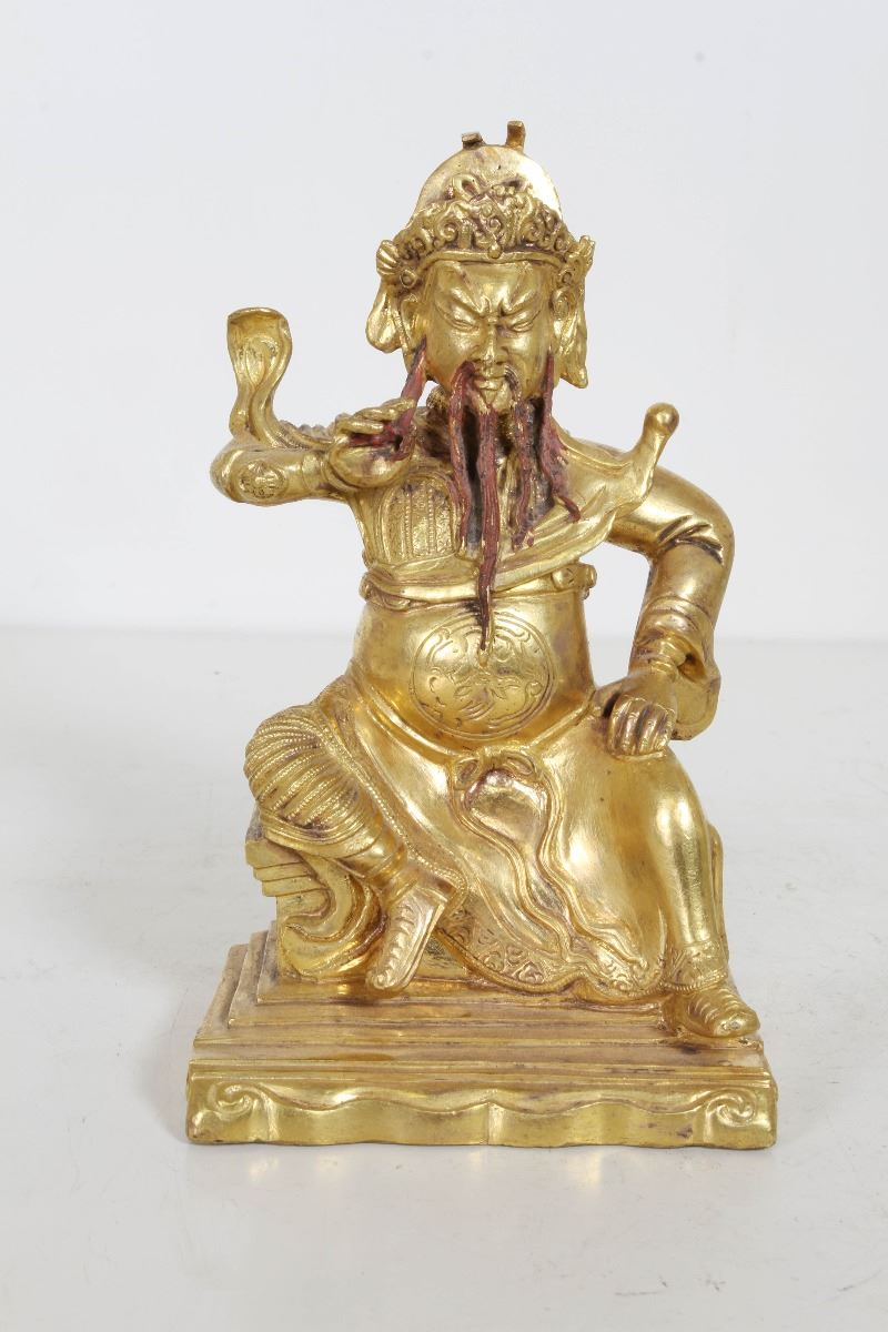 [CHINESE]A LATE 19TH CENTURY GILT-BRONZE FIGURE OF GUANDI Seated on a rectangular platform with a fierce expression. H:6.25"十九世纪后精美铜鎏金关公像摆件