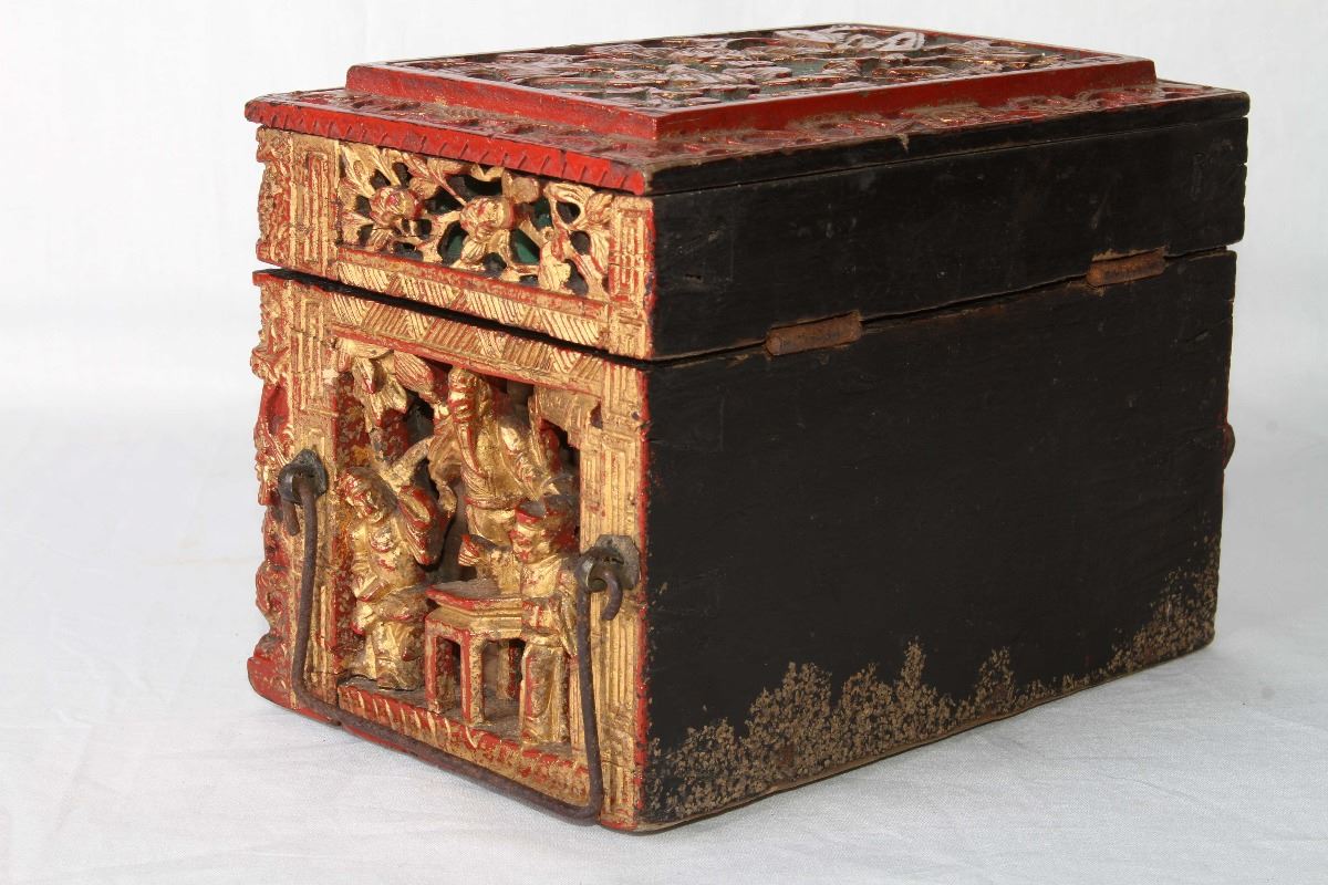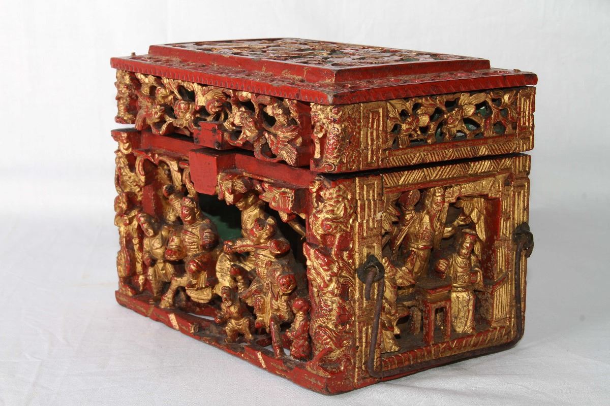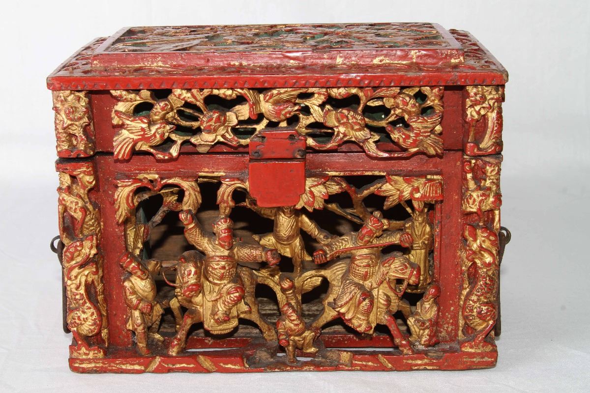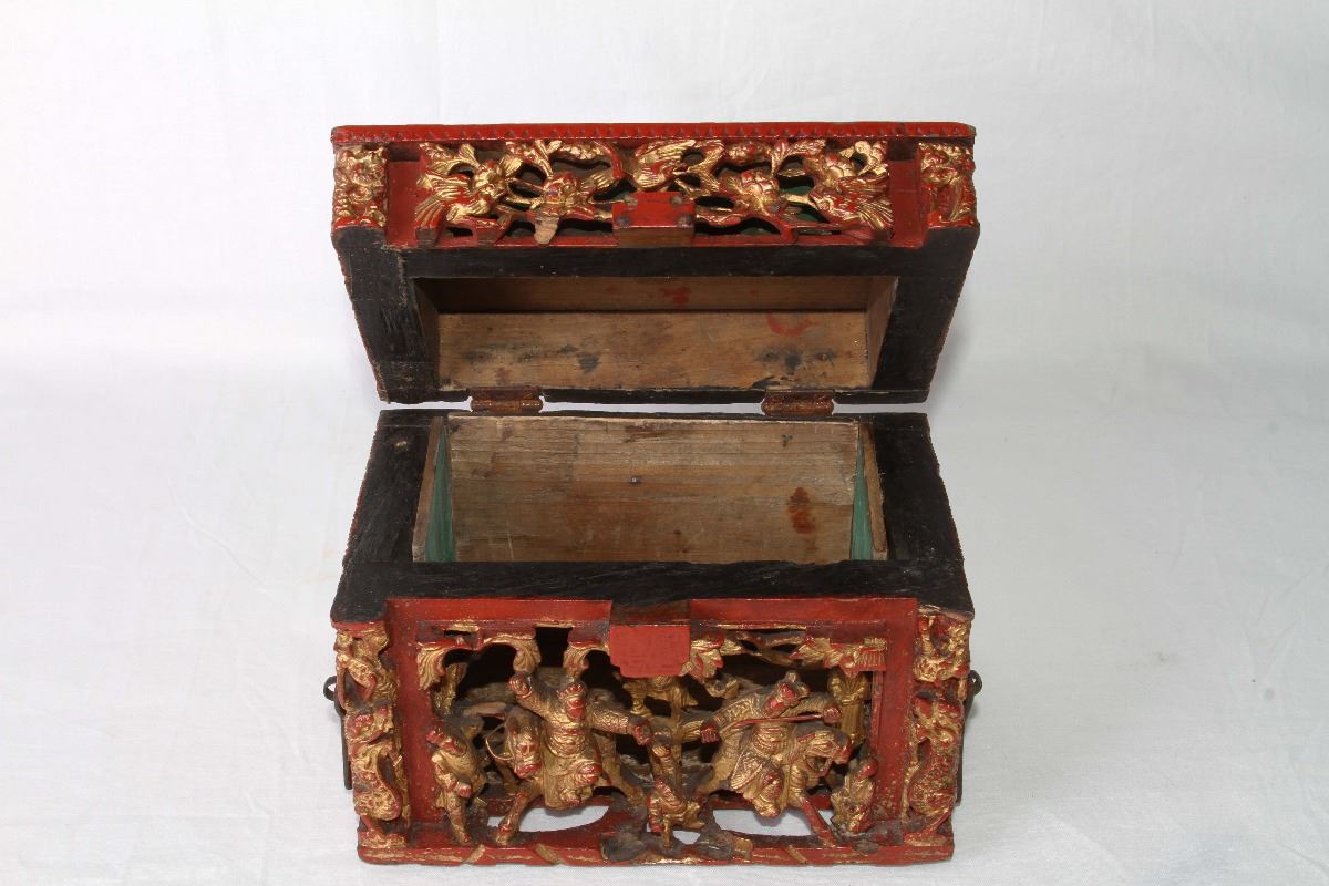 [CHINESE]A LATE 19TH CENTURY GILT WOOD BOX CARVED WITH THE STORIES OF THE THREE KINGDOMS AND DRAGON L:8.15" W:5.5" H:6"十九世纪后木雕描金三国故事龙纹盒