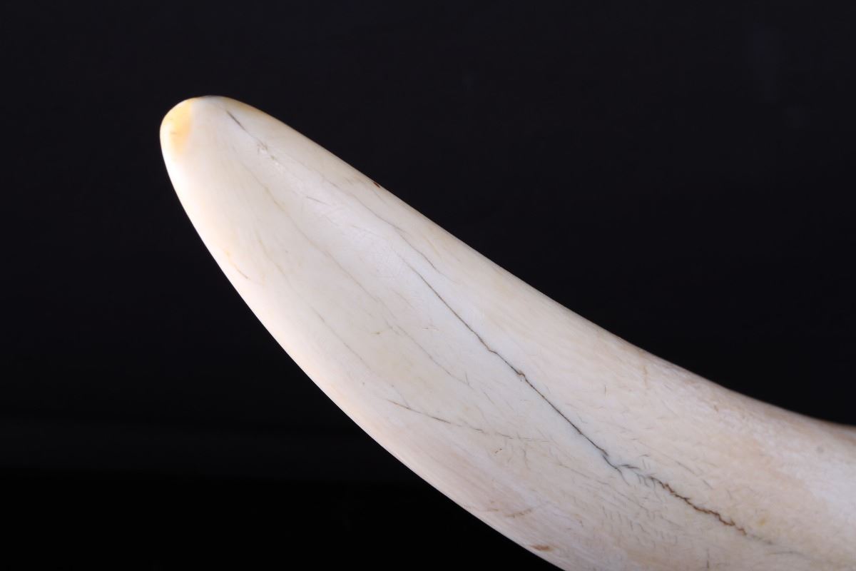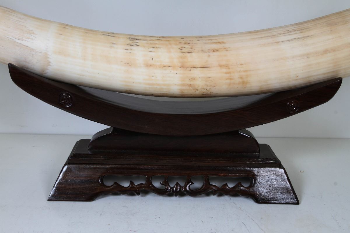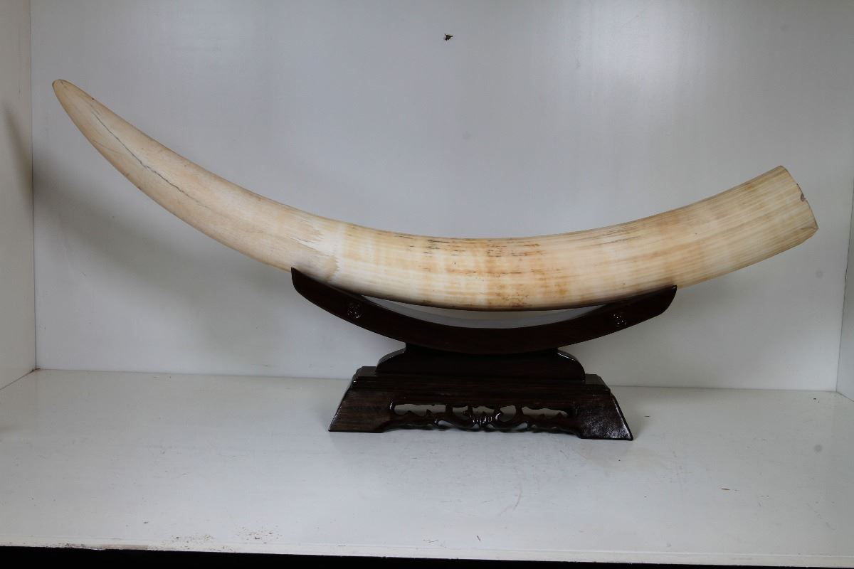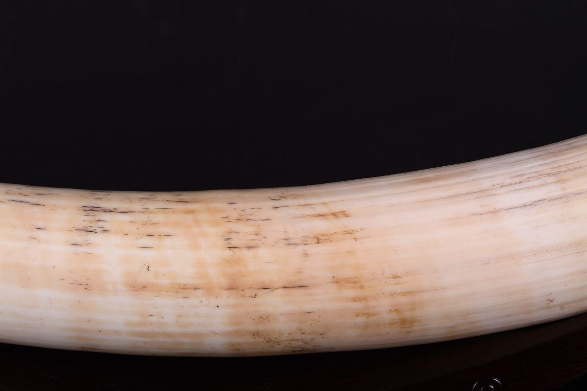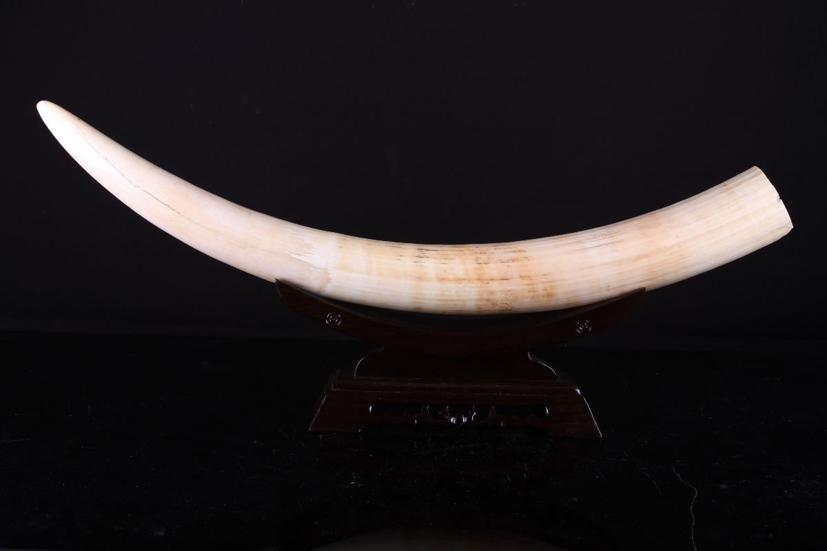 [CHINESE]A LATE 19TH CENTURY IVORY ORNAMENT WITH TANMU WOOD STAND(2673g)(MINOR DAMAGE ON THE IVORY) L:28" H:3" DISCLAIMER: This item is restricted from export out of the country due to protection under CITES (Convention on International Trade in Endangered Species). EXPORT IS AT THE BUYER'S RISK. Please note that bidders from the United States are not allowed to have ivory or rhino horn shipped into the country十九世纪后进口象牙原牙带檀木底座(2673g) (牙口有损伤)