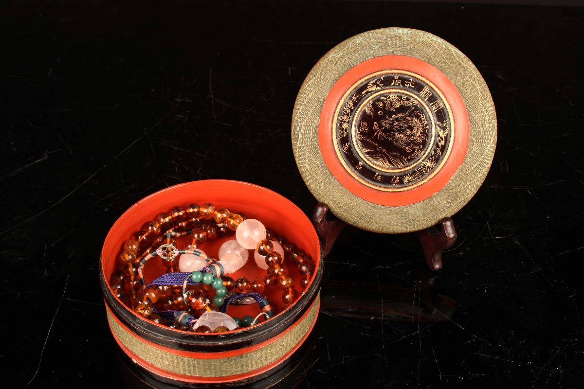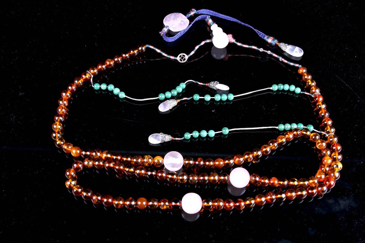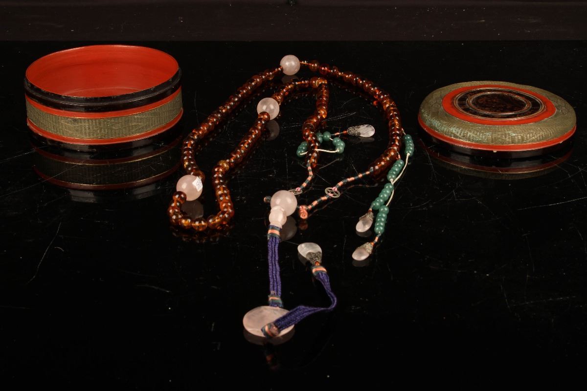 [CHINESE]A LATE 19TH CENTURY QING DYNASTY STYLED AMBER COURT BEADS WITH AMETHYST AND JADE WITH LACQURE BOX L:43"十九世纪后蜜蜡朝珠一串(佩紫水晶,碧玉)带漆器盒