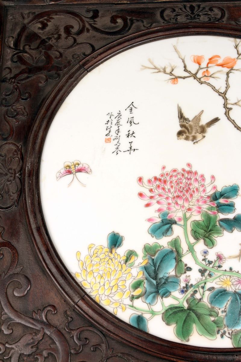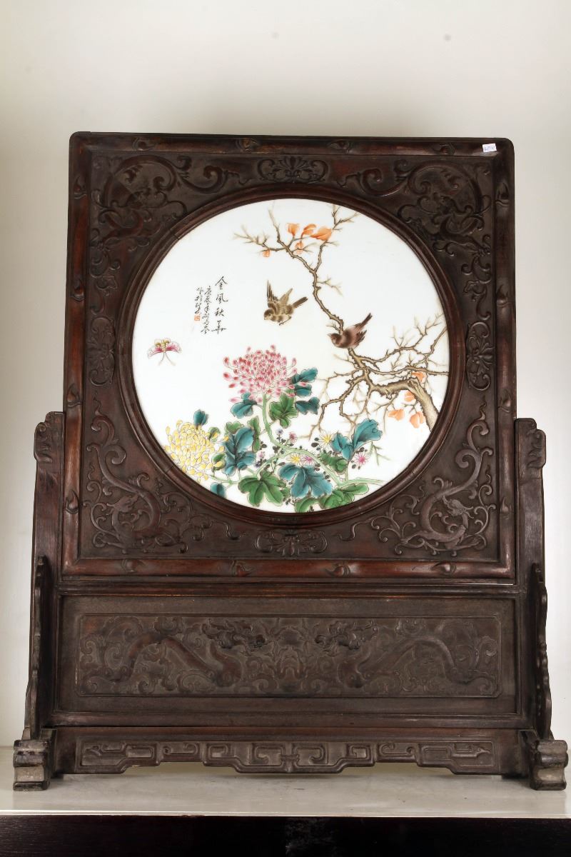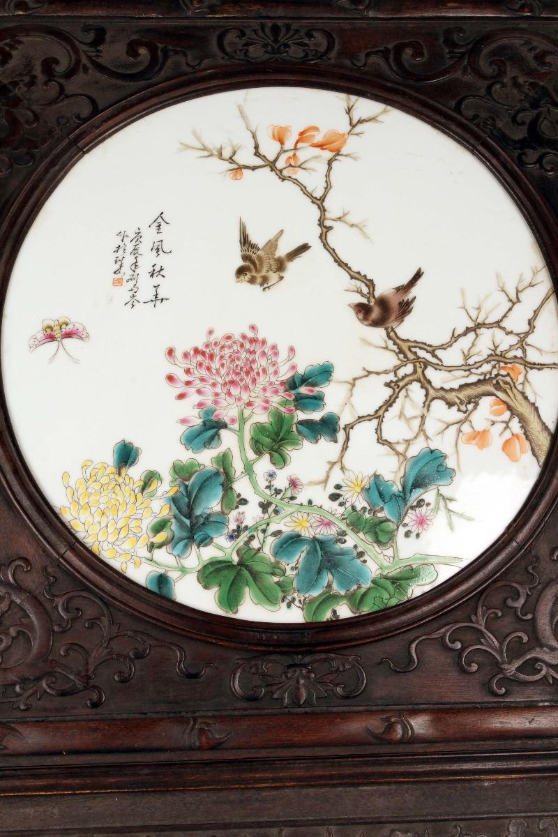 [CHINESE] A "LIUYUCEN"MARKED FAMILLE ROSE SCREEN PAINTED WITH BIRDS L:24" W:8.5" H:30"刘雨岑款粉彩“花鸟”瓷板插屏