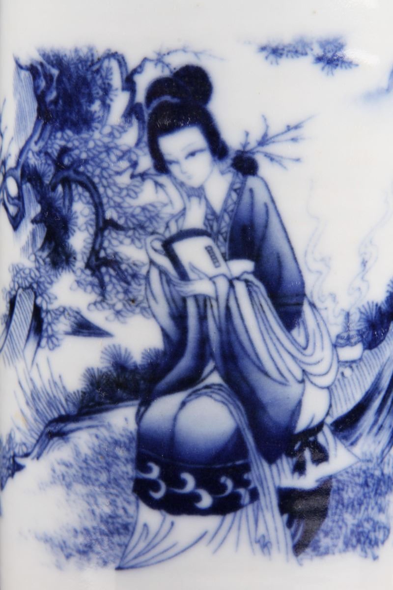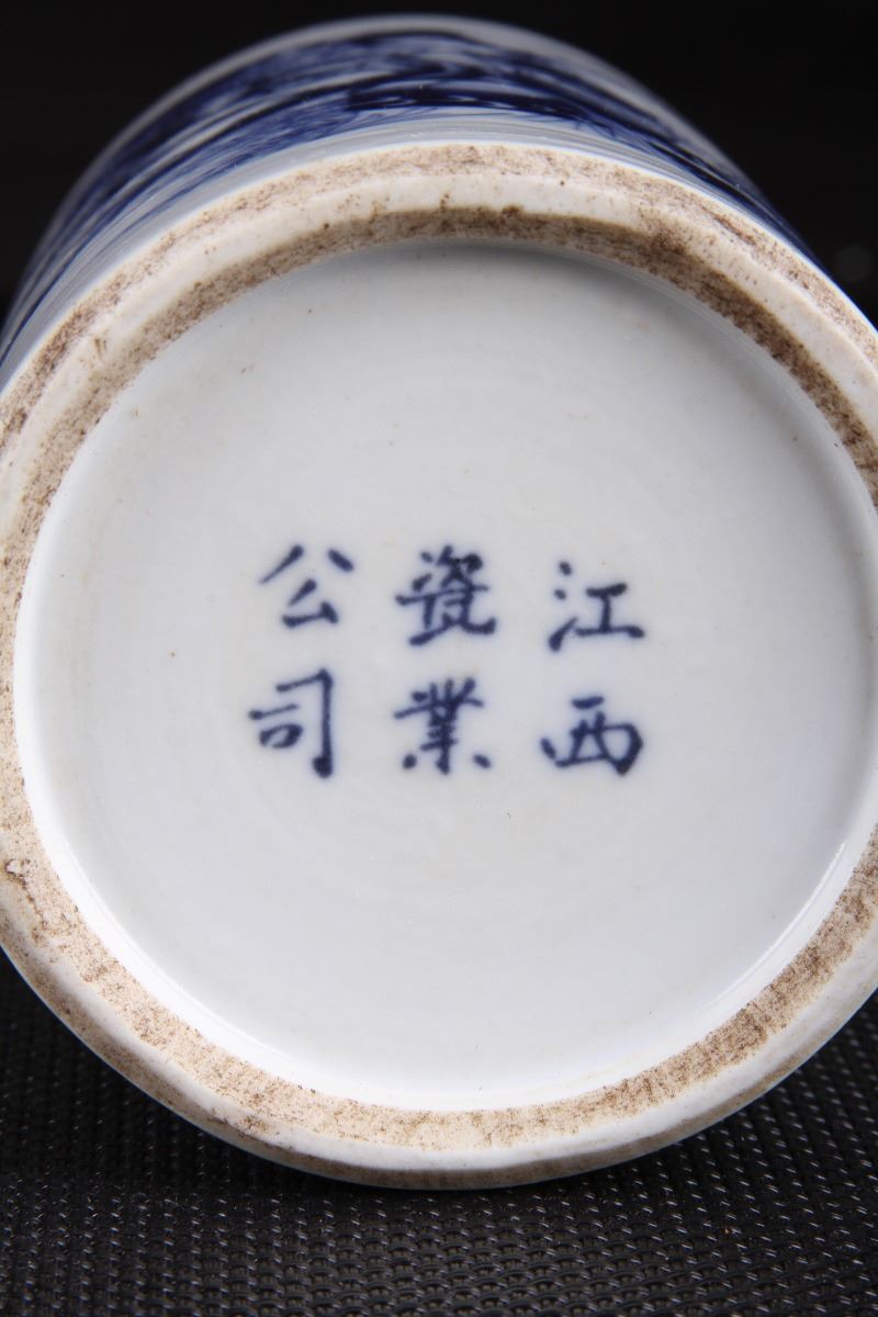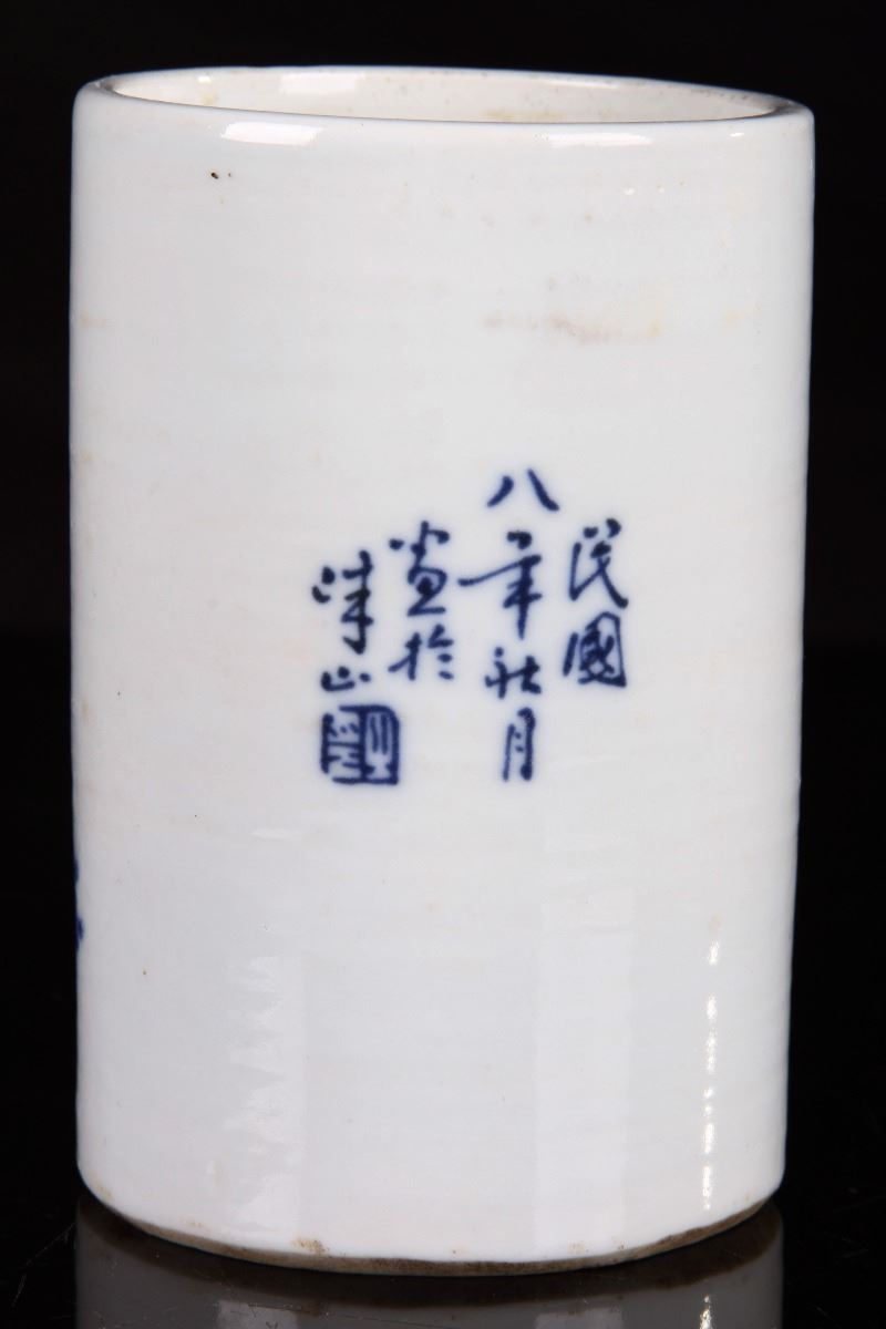 [CHINESE] A "MIN GUO BA NIAN" INSCRIBED BLUE AND WHITE PORCELAIN BRUSH POT ORNAMENT MARKED BY "JIANGXICIYEGONGSIZHIZAO" W:3" H:4.75"“民国八年”江西瓷业公司制造款青花“黛玉读书”笔筒摆件