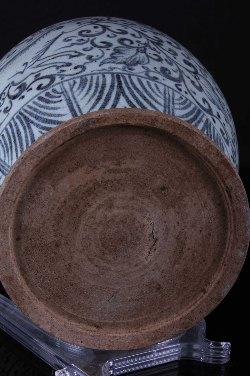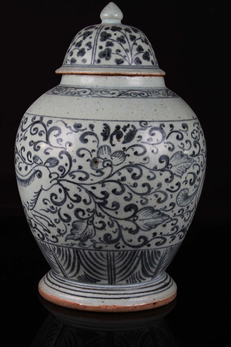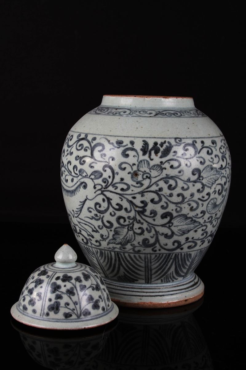 [CHINESE]A MING DYNASTY STYLED BLUE AND WHITE JAR PAINTED WITH TWINE PATTERNS W:7" H:11.25"明式青花缠枝纹将军罐