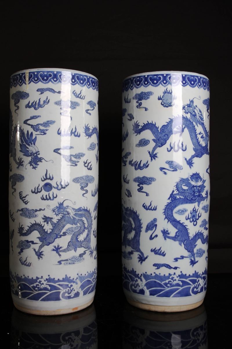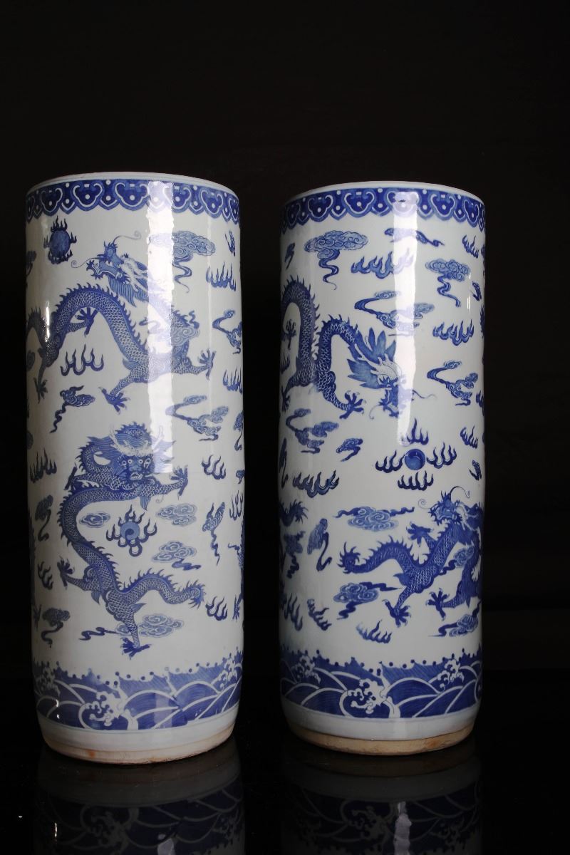 [CHINESE]A PAIR OF LATE 19TH CENTURY BLUE AND WHITE PORCELAIN POT PAINTED WITH CLOUD AND DRAGONS W:9" H:23.5"十九世纪后青花灵芝云龙纹伞筒一对