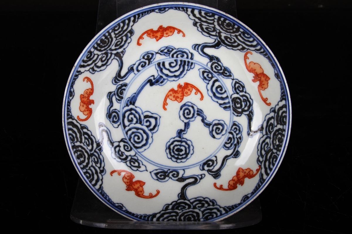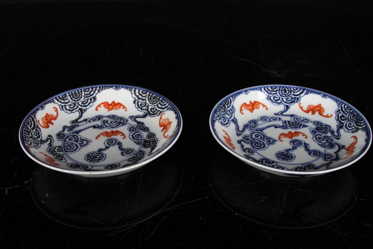 [CHINESE]A PAIR OF "YI MOU DA JI"MARKED BLUE AND WHITE WITH IRON RED GLAZED PORCELAIN PLATES PAINTED WITH BATS AND CLOUD W:5.25" H:1"乙卯大记款青花矾红五福灵芝云纹盘一对