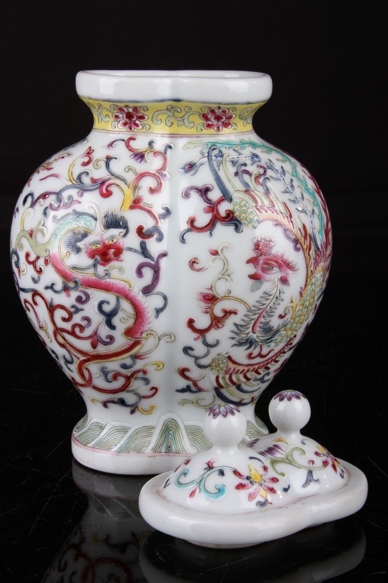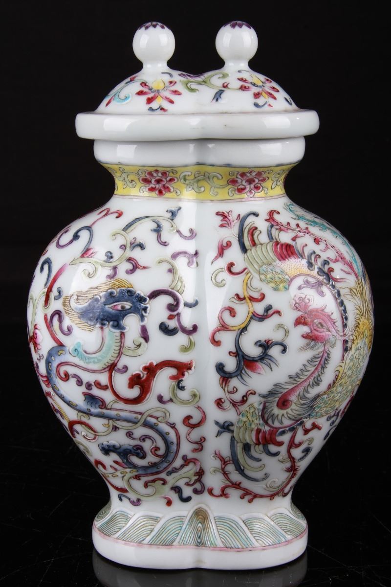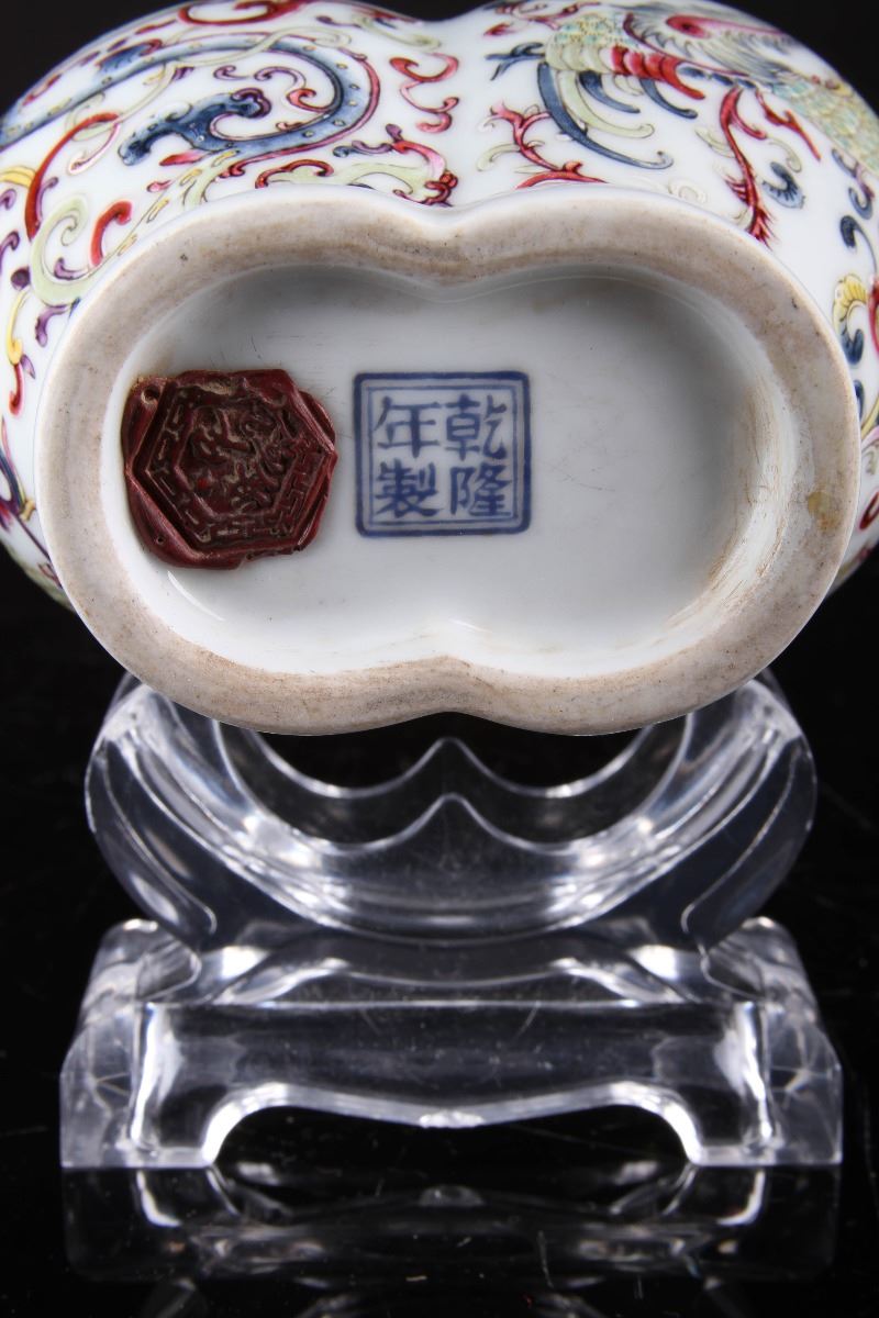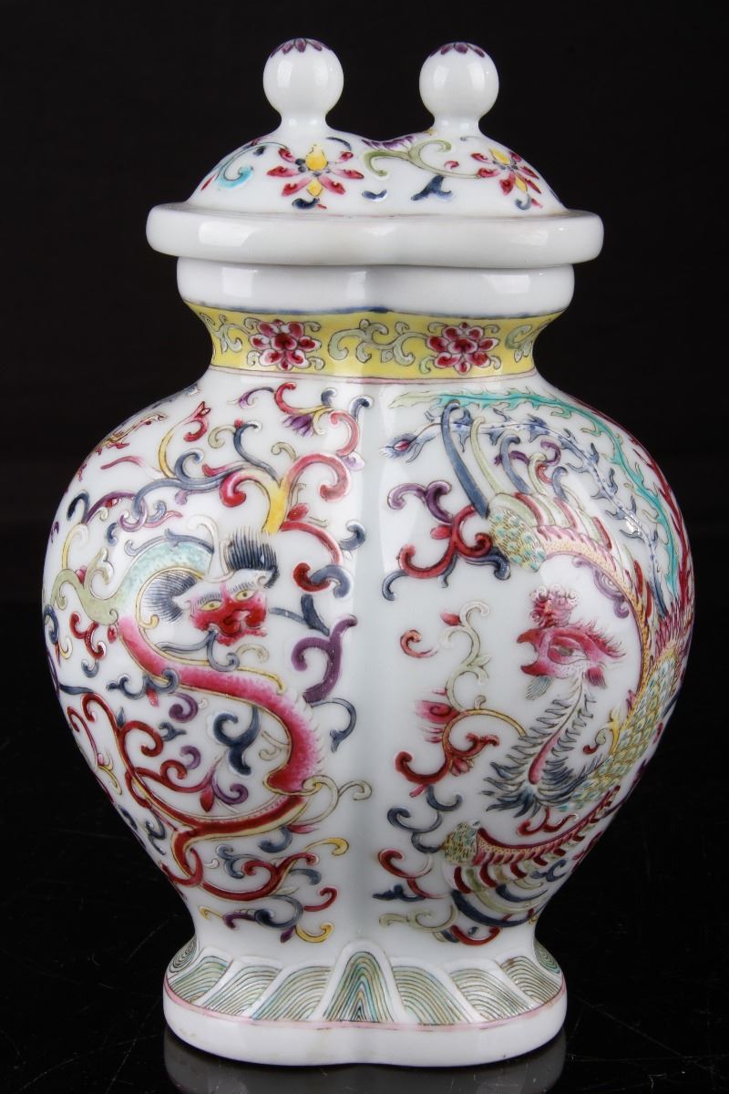 [CHINESE]A "QIANLONGNIANZHI"MARKED FAMILLE ROSE PORCELAIN VASE PAINTED WITH DRAGONS AND PHOENIX W:4.5" H:8"”乾隆年制“款粉彩龙凤呈祥奇型赏瓶