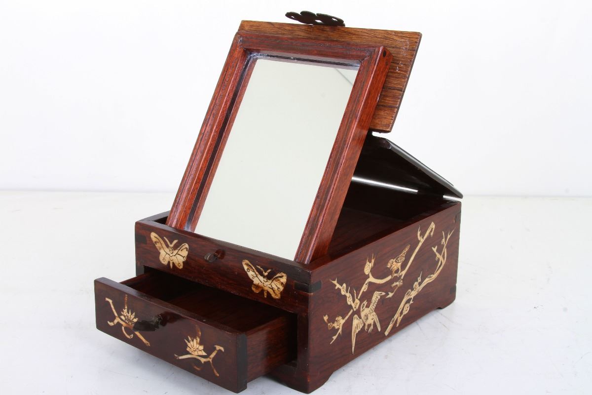 [CHINESE]A ROSEWOOD DRESSING BOX INLAID WITH BONES L:5" W:6.5" H:3"紅木镶骨制花鸟纹化妝盒一隻