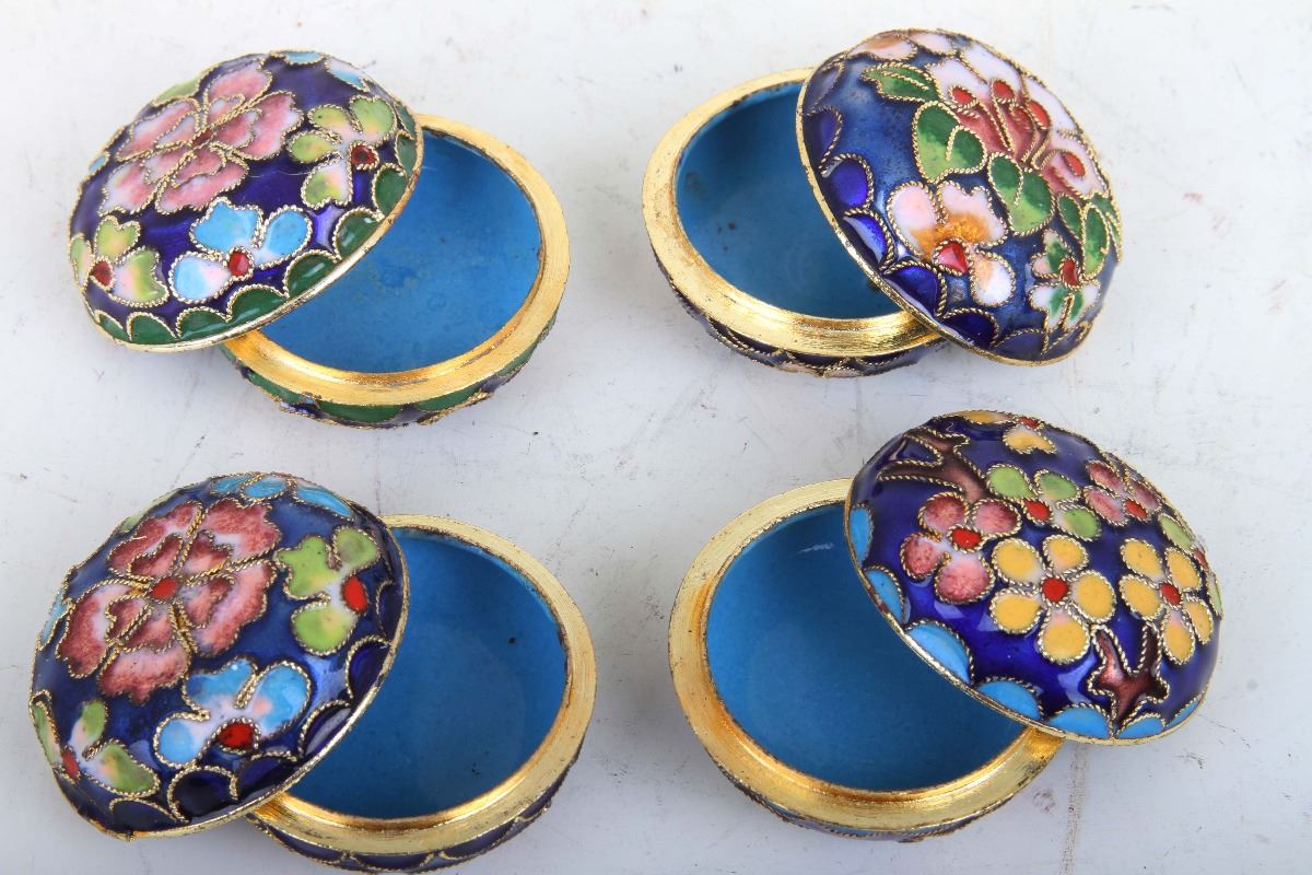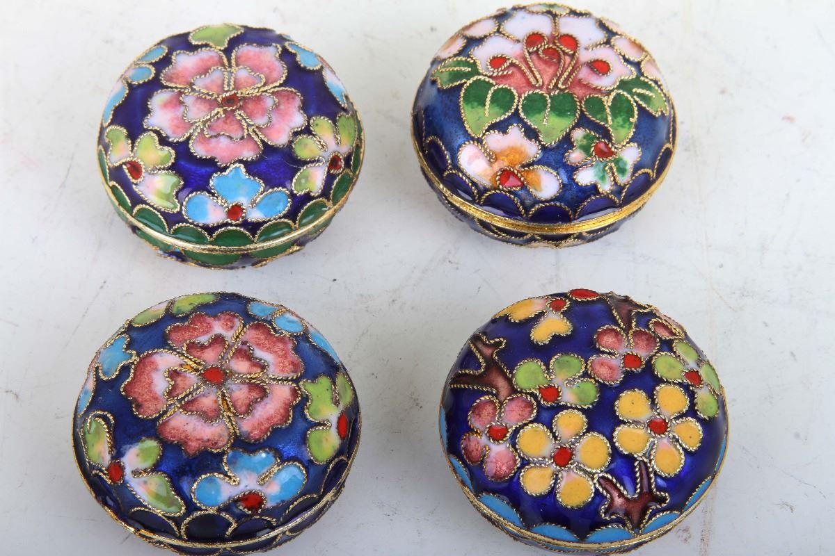 [CHINESE]A SET OF CLOISONN ENAMEL BOX PAINTED WITH FLOWERS (4 ITEMS) (MEASURED WITH THE LARGEST ITEM) W:1.5" H:0.75"景泰蓝花卉纹盖盒组(四件) (最大物品计量)