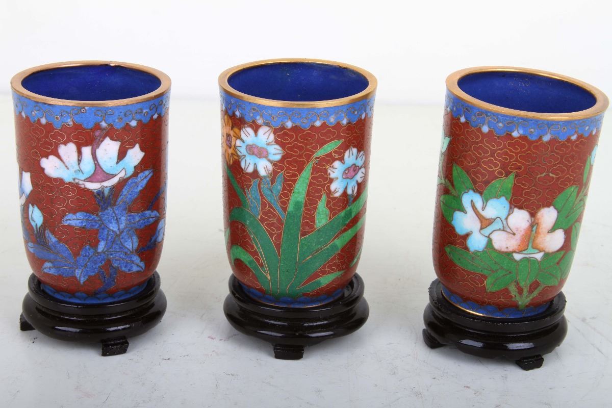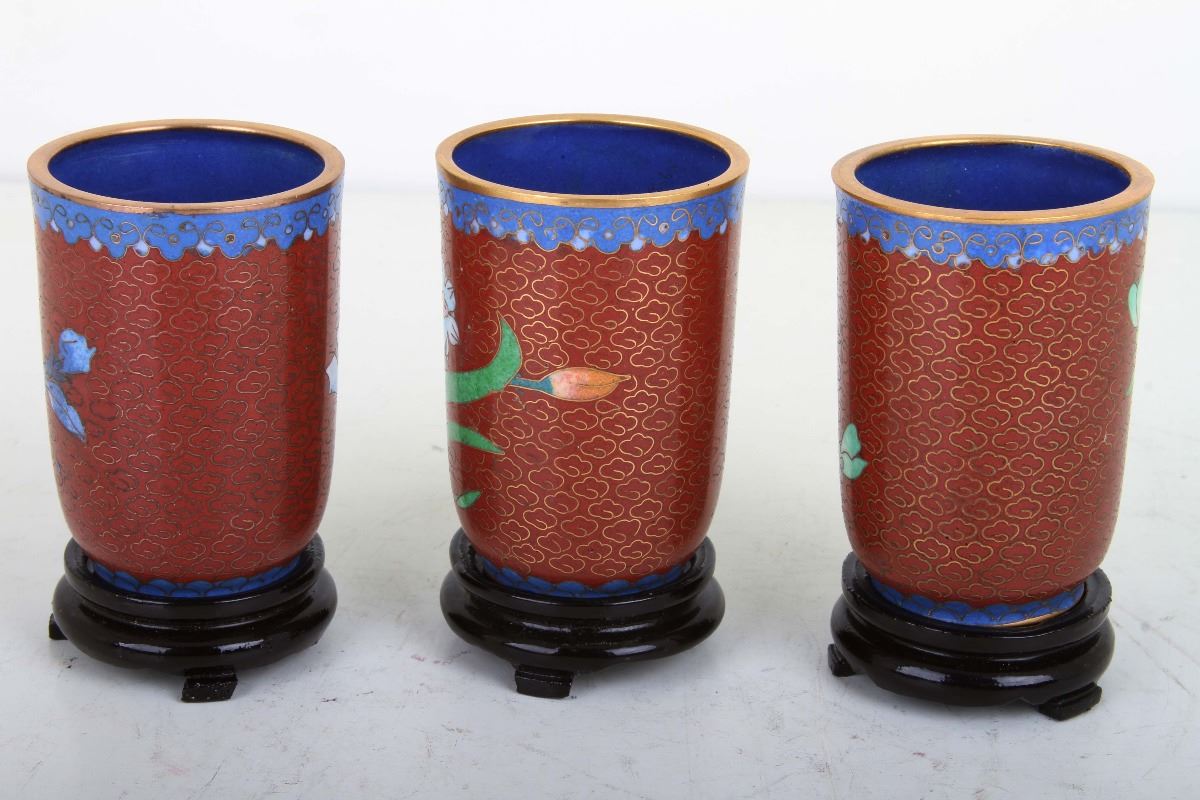[CHINESE]A SET OF CLOISONN ENAMEL BRUSH POT PAINTED WITH FLOWRS (3 ITEMS) (MEASURED WITH THE LARGEST ITEM) W:2" H:3"景泰蓝花卉笔筒组(3件)(最大物品计量)