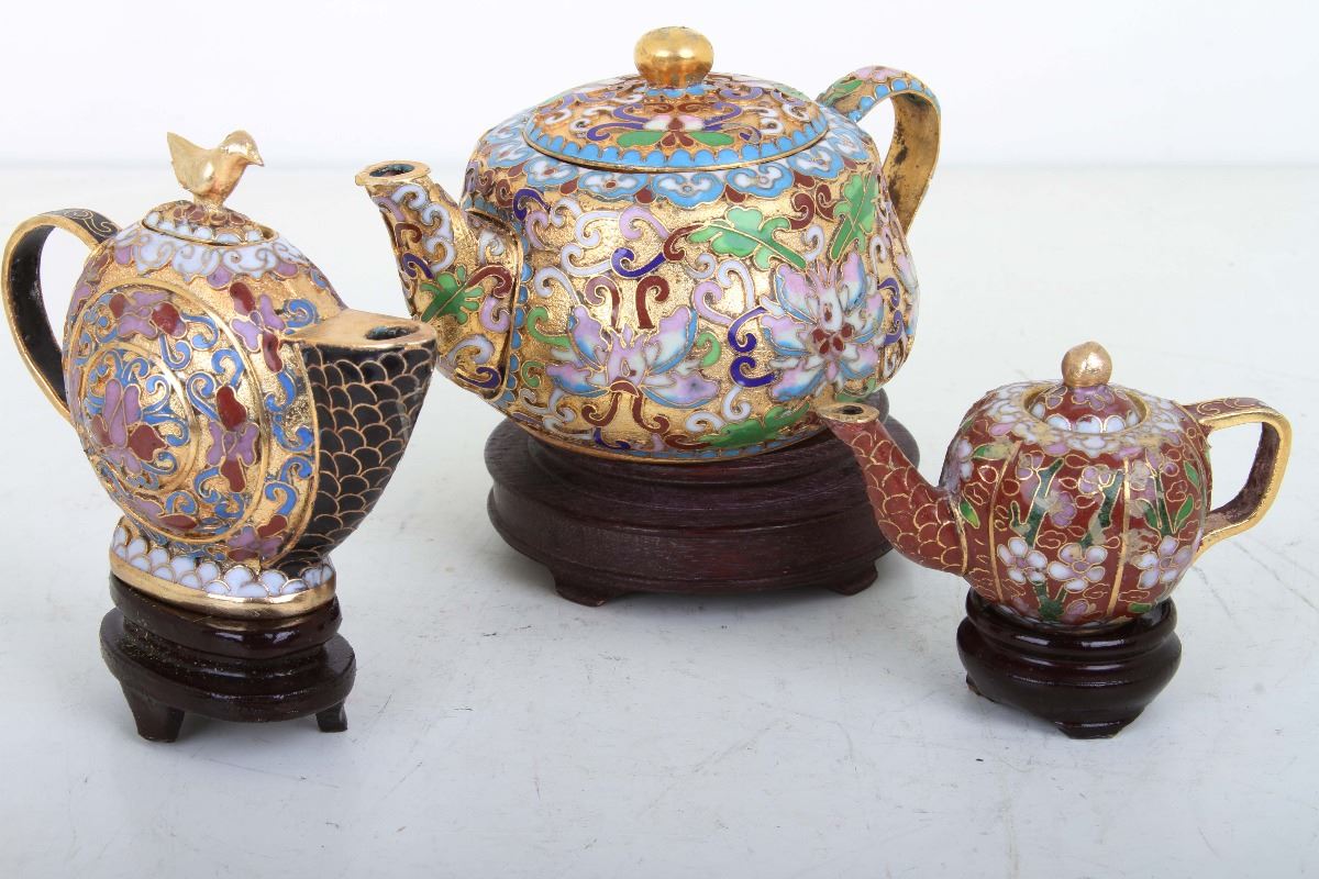 [CHINESE]A SET OF CLOISONN ENAMEL TEA POT PAINTED WITH FLOWERS (3 ITEMS) (MEASURED WITH THE LARGEST ITEM) L:4.75" W:3.25" H:2.75"景泰藍花卉纹茶壶一组(3件)(最大物品计量)