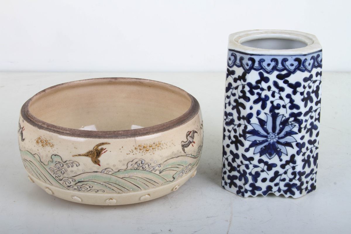 [CHINESE]A SET OF JAPANESE STYLED FAMILLE ROSE PORCELAIN WATER POT AND "QIAN LONG NIAN ZHI"MARKED BLUE AND WHITE BRUSH POT PAINTED WITH BIRDS AND FLOWERS (2 ITEMS)(MEASURED WITH THE LARGEST ITEM) W:6" H:2.75"日式粉彩水盂及乾隆年制款青花笔筒组(两件)(最大物品计量)
