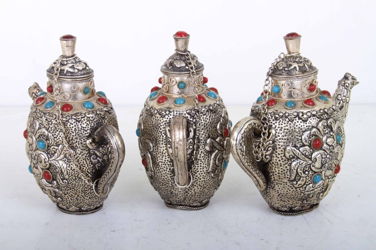 [CHINESE]A SET OF TIBETAN SLIVER TEA POT WITH PHOENIX HEAD(3 ITEMS)(MEASURED WITH THE LARGEST ITEM) L:5" W:2.25" H:4.75"藏银制花卉纹凤头壶一組(3件)(最大物品计量)