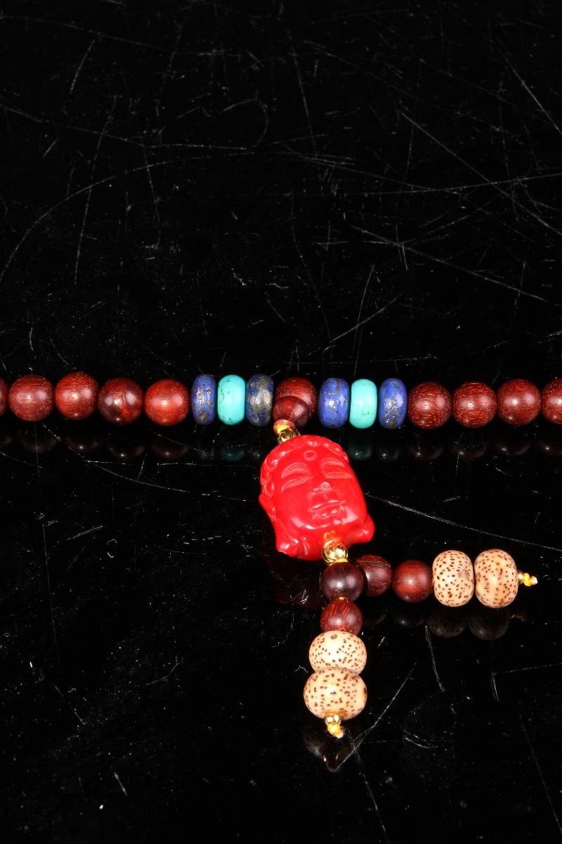 [CHINESE]A TANMU WOOD PRAYER BEADS WITH KALLAITE AND LAPIS L:21.5"108颗檀木佛珠挂串儿(带有珊瑚青金石及绿松石隔珠)