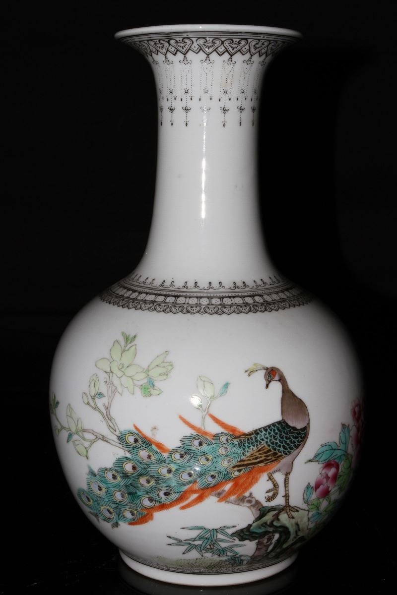 [CHINESE] A "ZHONGGUOJINGDEZHENZHI"MARKED FAMILLE ROSE PORCELAIN VASE PAINTED WITH FLOWERS AND BIRDS W:6" H:11"十九世纪后”中国景德镇制“款粉彩孔雀牡丹撇口瓶