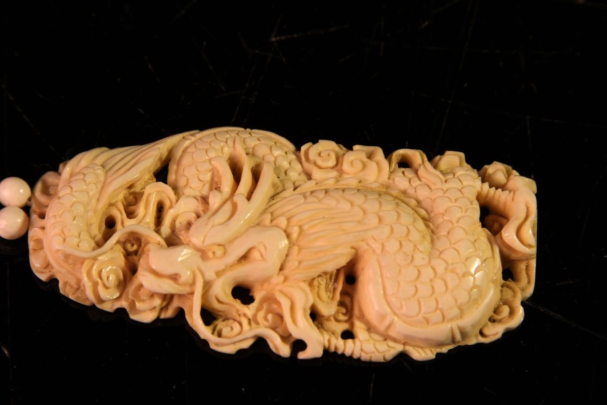[CHINESE]AN IVORY BEADS AND PENDANT CARVED WITH DRAGON (26g) L:1.45" H:3" DISCLAIMER: This item is restricted from export out of the country due to protection under CITES (Convention on International Trade in Endangered Species). EXPORT IS AT THE BUYER'S RISK. Please note that bidders from the United States are not allowed to have ivory or rhino horn shipped into the country.象牙雕龙纹挂牌及串珠 (26g)